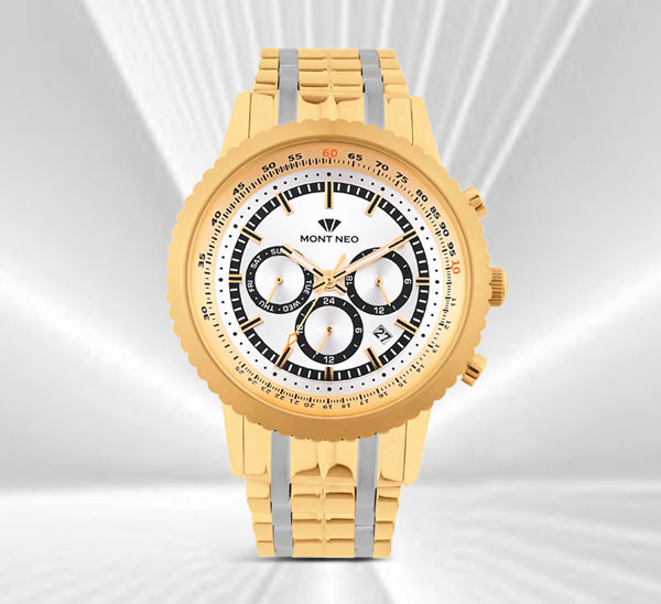 The Mont Neo Men’s Quartz Black Dial Multi-Function Metal Watch (1050M-M2204) perfectly blends functionality and sophistication. Featuring a sleek 36 mm round metal case and a striking black dial, it showcases a multi-function display powered by precise quartz movement. The luxurious gold metal strap (22 mm) with a butterfly clasp adds a touch of elegance, making it ideal for casual occasions. Built with durable mineral glass and water-resistant for up to 3 ATMs, this watch offers style and reliability. Backed by a 2-year warranty, the Mont Neo watch is a timeless accessory for the modern man.