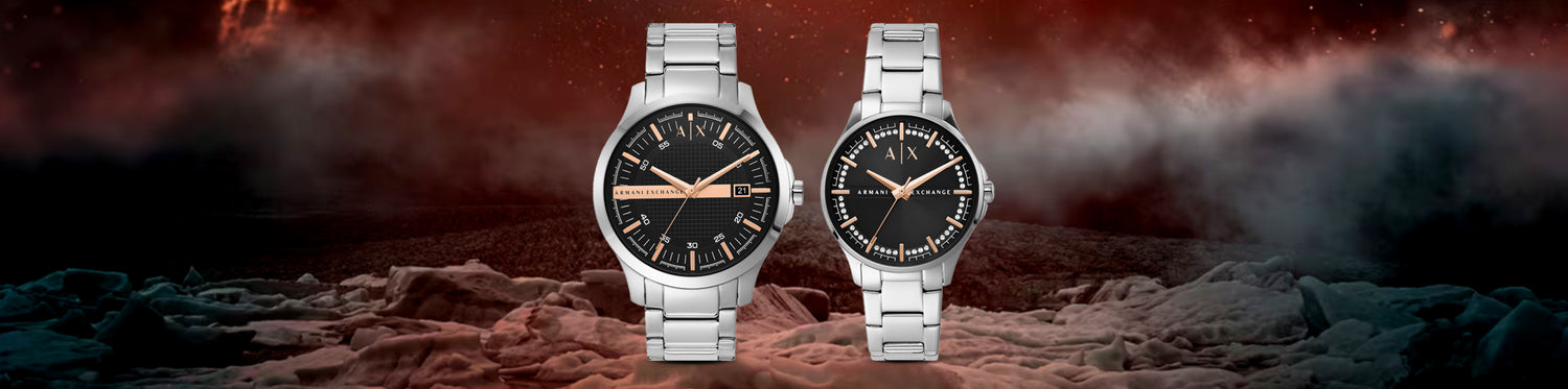 The sleek and modern aesthetic of this Armani Exchange set showcases an effortless elegance. Its minimalist design, combined with a shimmering stainless steel finish, allows couples to wear them with confidence. These watches embody contemporary chic, effortlessly blending into your daily wardrobe while making a striking impression.