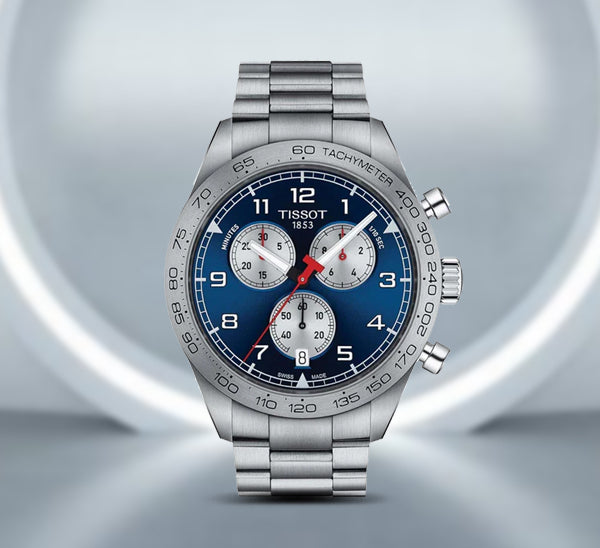 This watch is a refined yet robust timepiece that combines precision engineering with a timeless design. Built with Tissot’s motorsport heritage in mind, this watch is perfect for those who demand performance and style. Featuring a sleek stainless steel dial and matching grey stainless steel strap, this watch exudes durability and elegance. The sturdy materials ensure it can withstand daily wear while maintaining a polished look. The butterfly clasp buckle adds security and comfort, allowing the watch to sit snugly on the wrist while providing ease of wear.