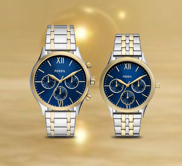 The Fossil Fenmore Couple Quartz Blue Dial Multi-Function Stainless Steel Watch BQ2900SET is an elegant and cohesive timepiece set, perfect for couples who want to share a matching style. This set features two beautifully crafted watches with dark blue dials and silver-gold stainless steel straps. The men’s watch has a 44 mm case, while the women's version has a slightly smaller 36 mm case. Both are made from sturdy brass for durability.