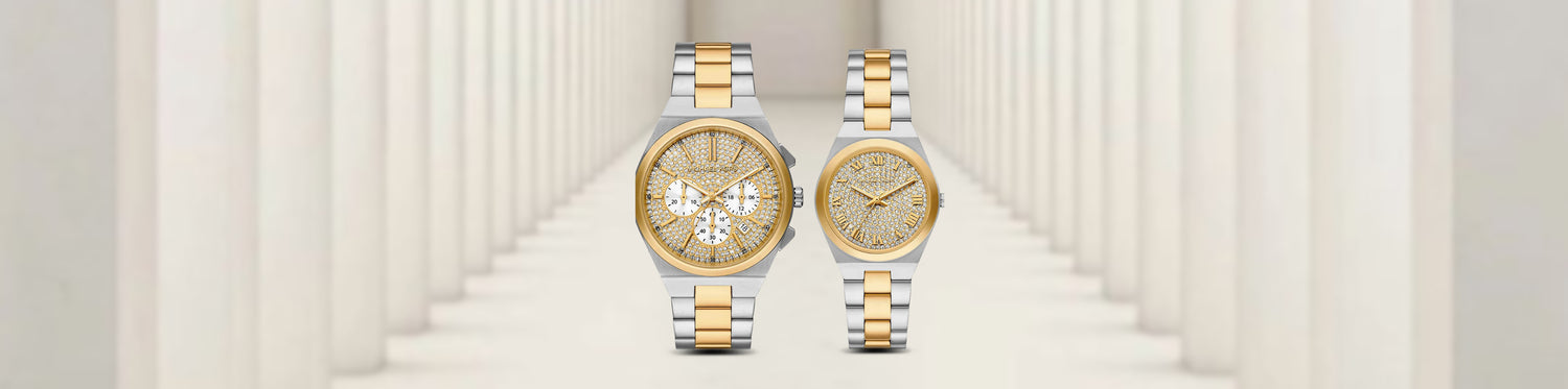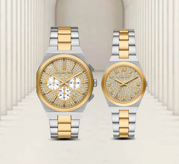 This luxurious couples set is a testament to timeless elegance, perfect for couples who appreciate the art of subtle sophistication. Featuring the Chapman for him and the Scarlett Mini for her, these watches are designed to make a lasting impression. The silver sunray dial, paired with gold Roman numeral hour indicators and matching hands, strikes the perfect balance between classic and contemporary. The multifunction chronograph adds practical refinement, while the two-tone stainless steel bracelets in silver with gold accents bring a harmonious, polished look. This piece is a wonderful gift for couples, symbolising unity in style.
