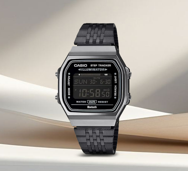 The Casio Vintage Men's Black Digital Stainless Steel Watch D148 (A168WEGB-1BDF) offers a sleek, retro-inspired design with modern functionality. Featuring a square resin case and a black digital dial, this stylish timepiece is protected by durable acrylic glass. The black stainless steel band complements its minimalist look, while its quartz movement ensures reliable performance.