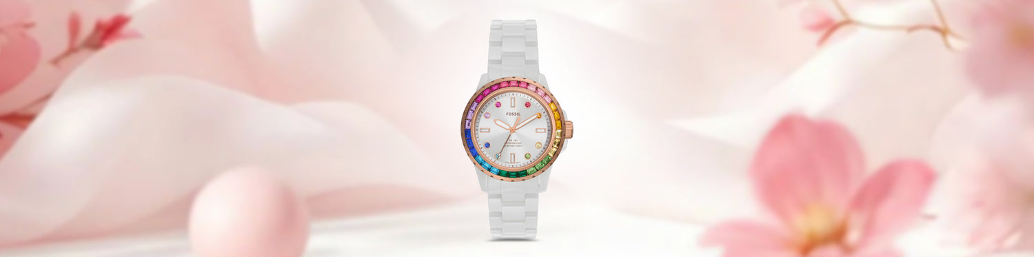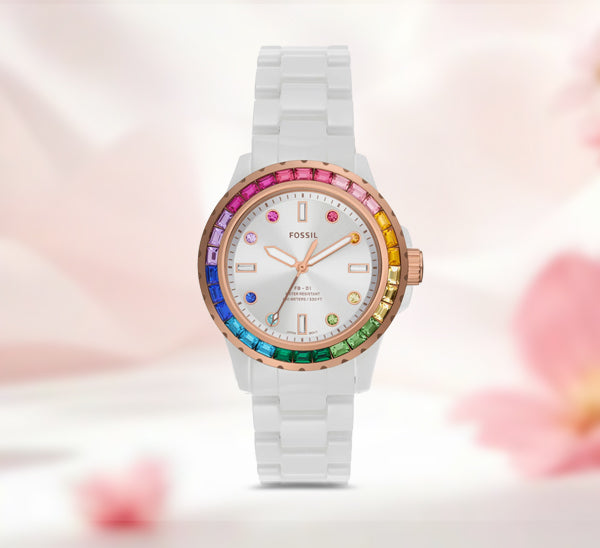 The Fossil CE1129 is unique, featuring a lustrous ceramic bracelet and a classic sunray white dial adorned with sparkling, colourful stones around the bezel. -