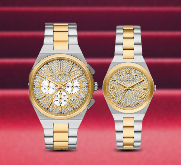 For parents who love a dash of glamour, this Michael Kors gold chronograph set is an unapologetic statement of bold, radiant love. Both watches shimmer with all-over pavé dials, a nod to the couple who has lived vibrantly, celebrated every milestone, and exuded luxury in life’s finer moments. His 45mm Lennox watch commands attention with its bold chronograph dial, a reminder of the complexity and depth of a long-lasting relationship. This timepiece pairs high functionality with a design that dares to shine.