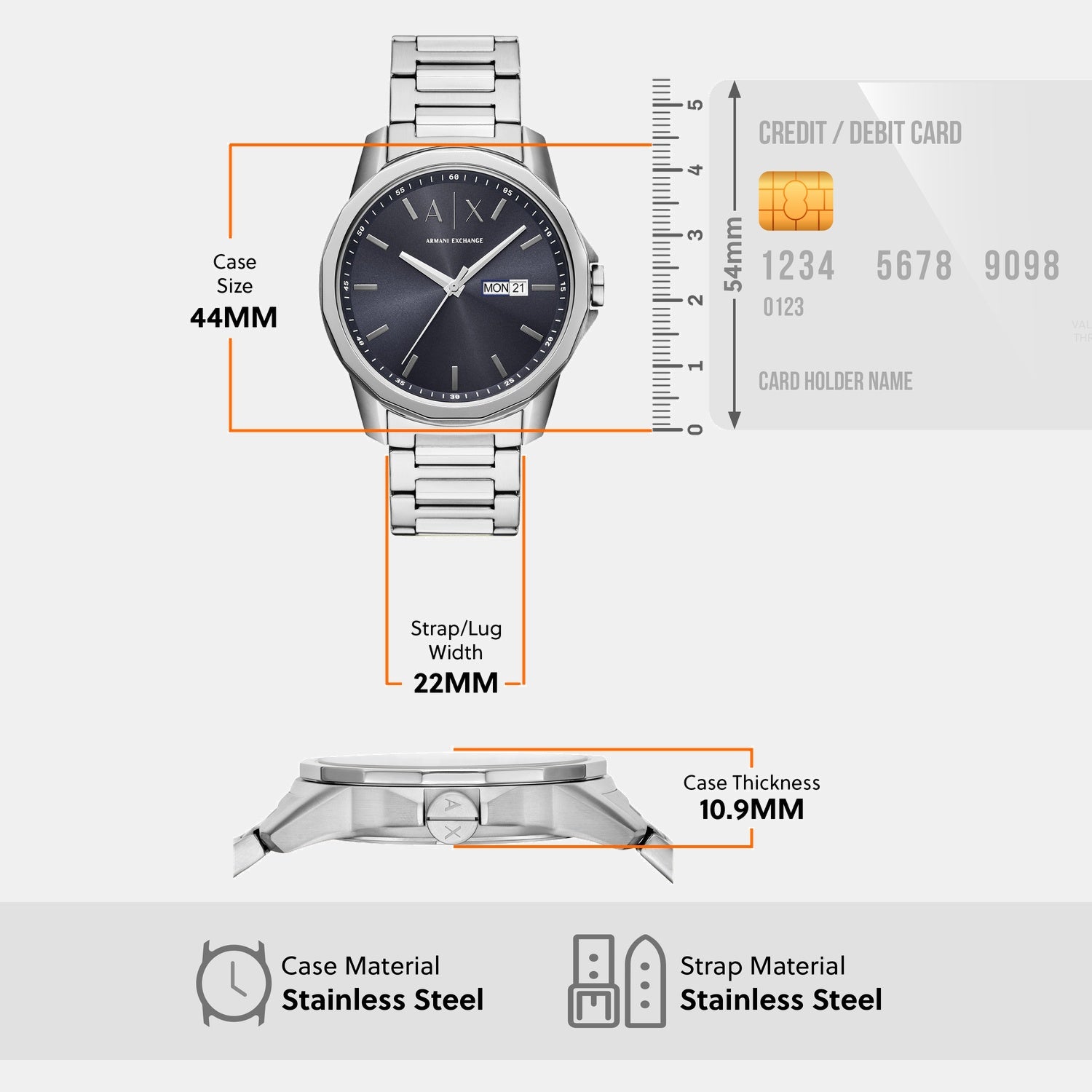 Crafted by Armani Exchange, this elegant timepiece exemplifies refined design. It is tailored for Men, featuring a Round case shape for timeless appeal. The Stainless Steel strap adds strength and sophistication. With a dial size of 44 mm, it balances subtlety and presence on the wrist. The strap width of 22 mm complements its sleek profile. The 10.9 mm case thickness ensures a lightweight feel. A Blue dial and Silver strap create a distinct contrast. The Foldover Clasp buckle secures comfort. Driven by Quartz movement, it delivers precision through Analog display. Protected by Mineral Glass and Stainless Steel dial material. It offers 5 ATM water resistance.