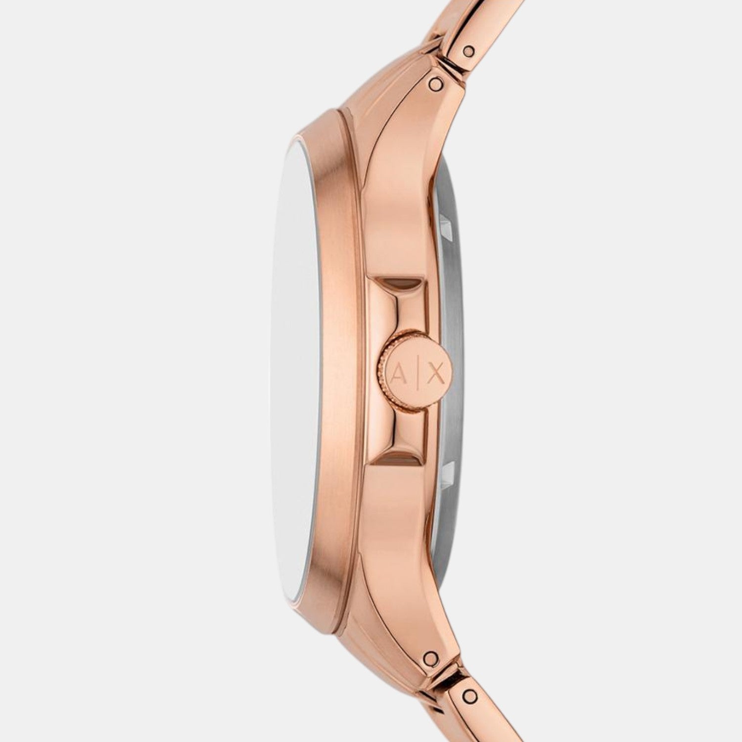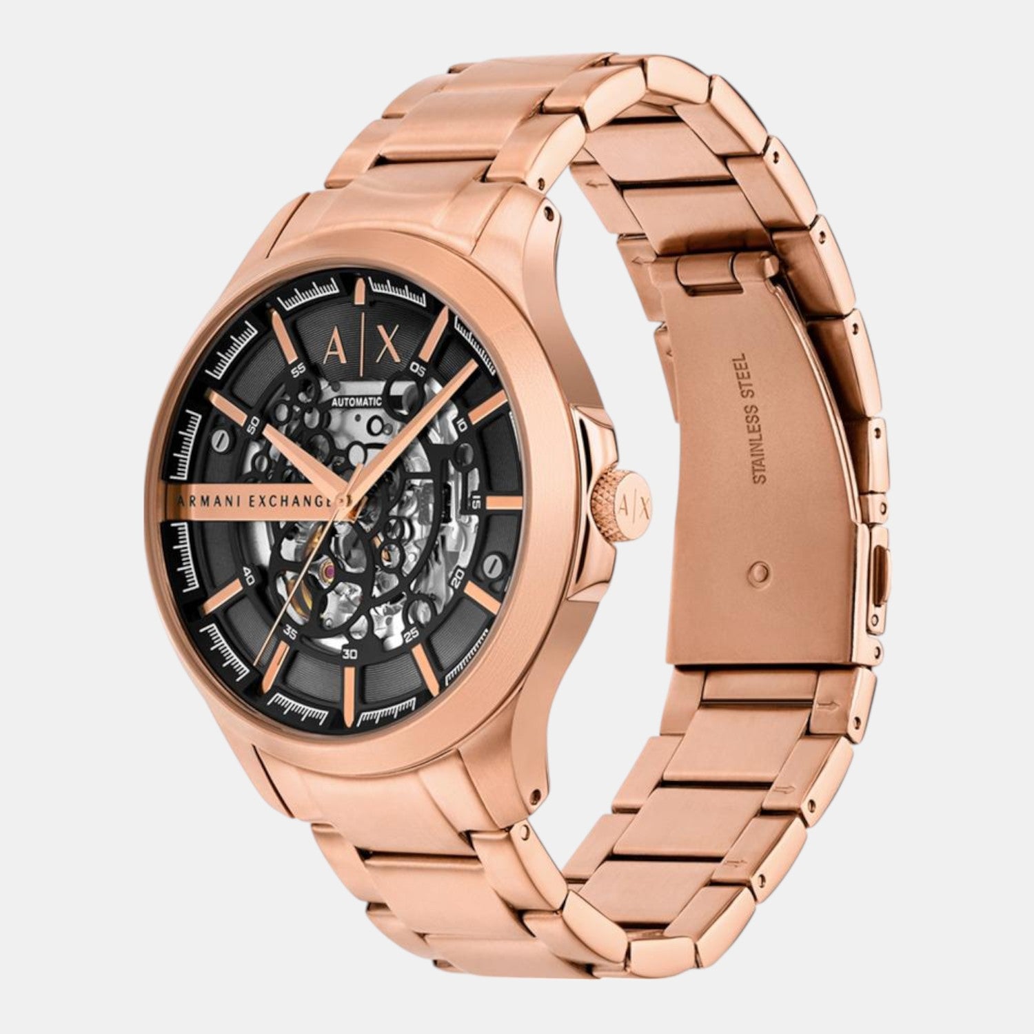Crafted by Armani Exchange, this elegant timepiece from the Na collection exemplifies refined design. It is tailored for Men, featuring a Round case shape for timeless appeal. The Stainless Steel strap adds strength and sophistication. With a dial size of 46 mm, it balances subtlety and presence on the wrist. The strap width of 22 mm complements its sleek profile. The 13 mm case thickness ensures a lightweight feel. A Black dial and Rose Gold strap create a distinct contrast. The Foldover Clasp buckle secures comfort. Driven by Automatic movement, it delivers precision through Analog display. Protected by Mineral Glass and Stainless Steel dial material. It offers 5 ATM water resistance.