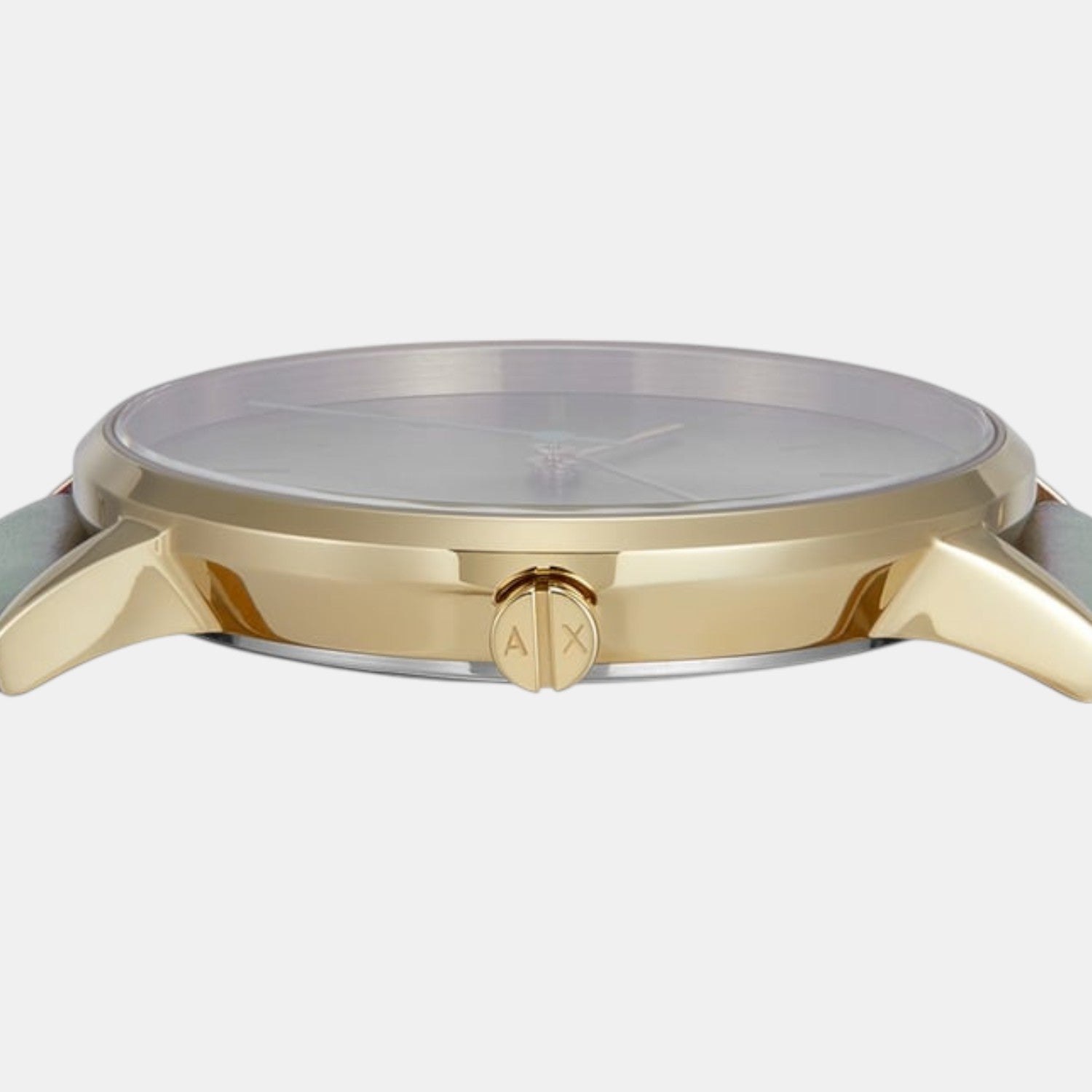 ×Armani Exchange's 36mm watch features a gray sunray dial, three-hand movement and gray leather strap.