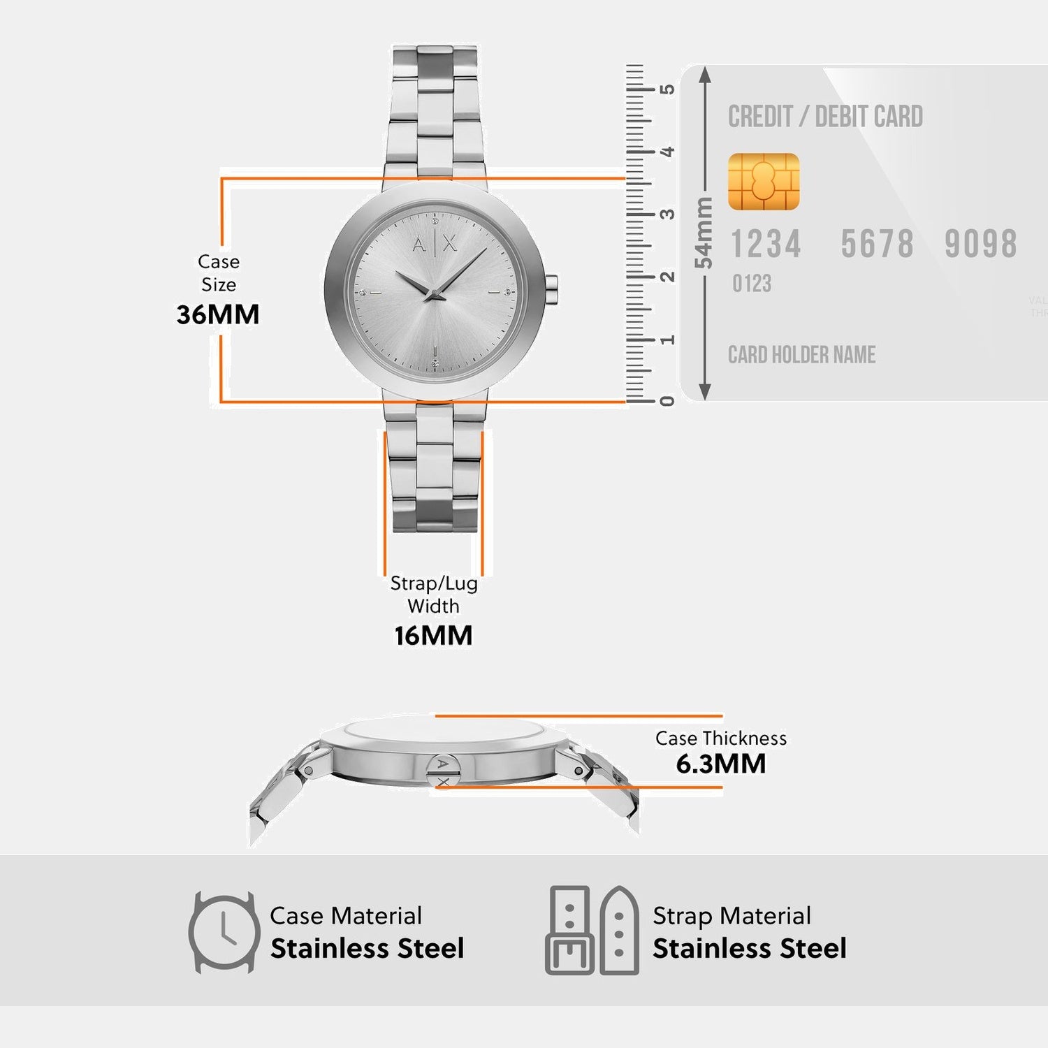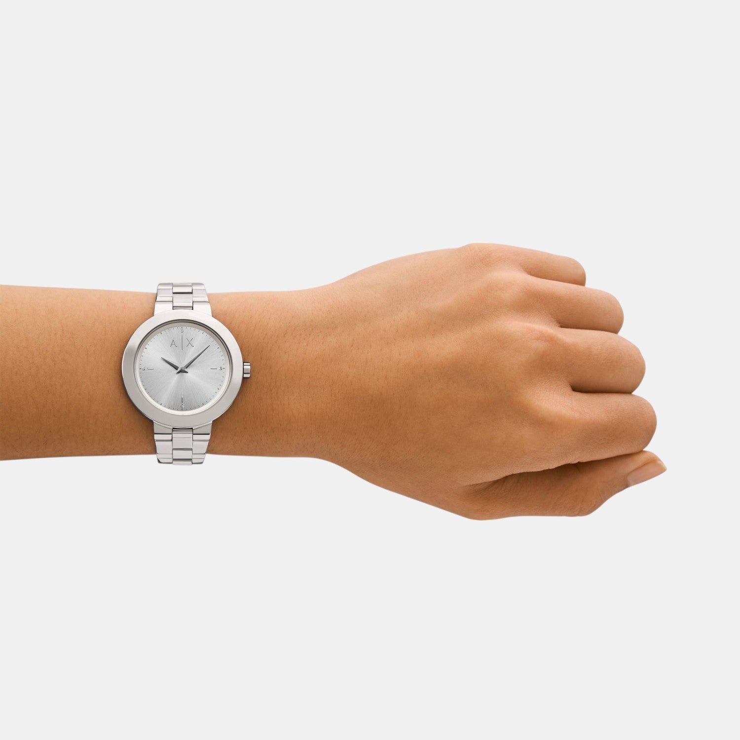 Crafted by Armani Exchange, this elegant timepiece from the Na collection exemplifies refined design. It is tailored for Women, featuring a Round case shape for timeless appeal. The Stainless Steel strap adds strength and sophistication. With a dial size of 36 mm, it balances subtlety and presence on the wrist. The strap width of 16 mm complements its sleek profile. The 6.3 mm case thickness ensures a lightweight feel. A Silver dial and Silver strap create a distinct contrast. The Foldover Clasp buckle secures comfort. Driven by Quartz movement, it delivers precision through Analog display. Protected by Mineral Glass and Stainless Steel dial material. It offers 5 ATM water resistance.