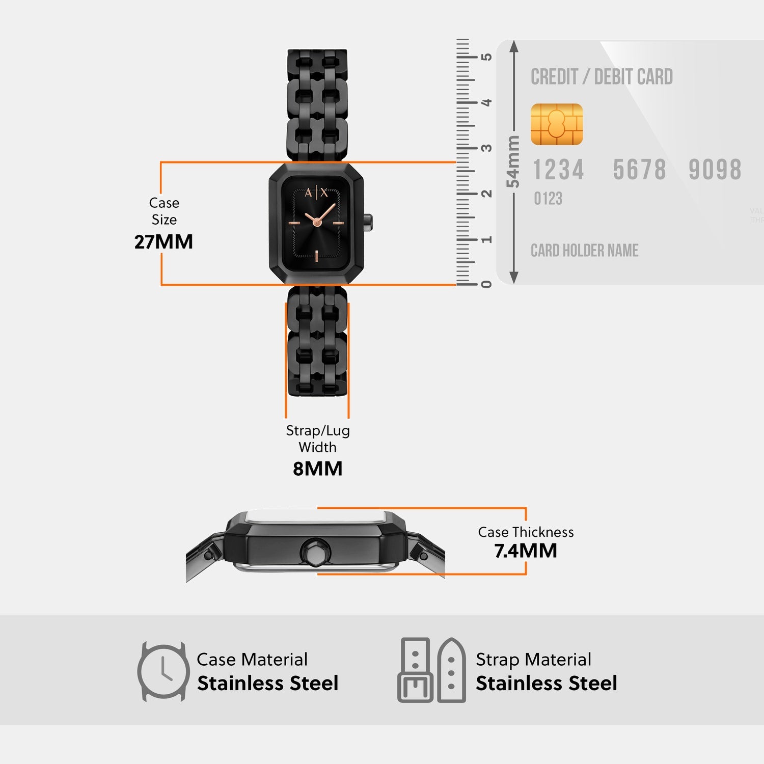 Crafted by Armani Exchange, this elegant timepiece exemplifies refined design. It is tailored for Women, featuring a Rectangular case shape for timeless appeal. The Stainless Steel strap adds strength and sophistication. With a dial size of 27 mm, it balances subtlety and presence on the wrist. The strap width of 8 mm complements its sleek profile. The 7.4 mm case thickness ensures a lightweight feel. A Black dial and Black strap create a distinct contrast. The Bracelet Clasp buckle secures comfort. Driven by Quartz movement, it delivers precision through Analog display. Protected by Mineral Glass and Stainless Steel dial material. It offers 5 ATM water resistance.