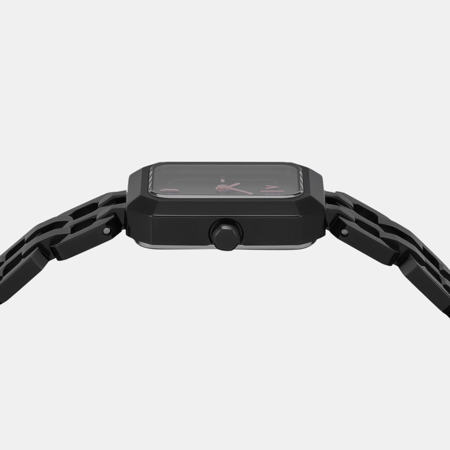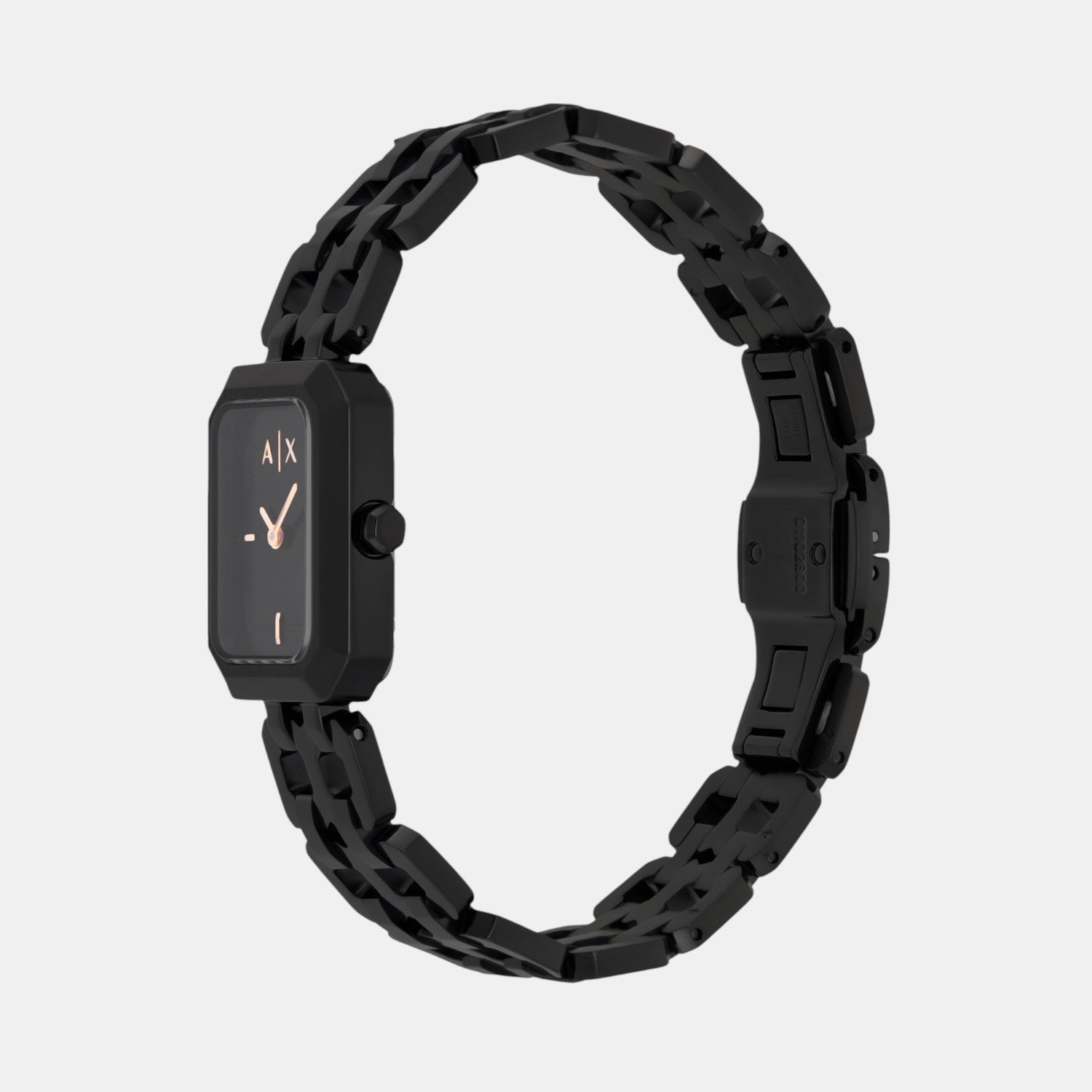 ×Armani Exchange's 27mm two-hand black stainless steel watch exudes modern sophistication. Featuring a sleek black sunray dial within a distinctive rectangular case, this timepiece perfectly balances elegance and functionality. The black stainless steel bracelet adds a touch of refinement, while the reliable quartz movement ensures accurate timekeeping. Ideal for the contemporary woman who values both style and precision.
