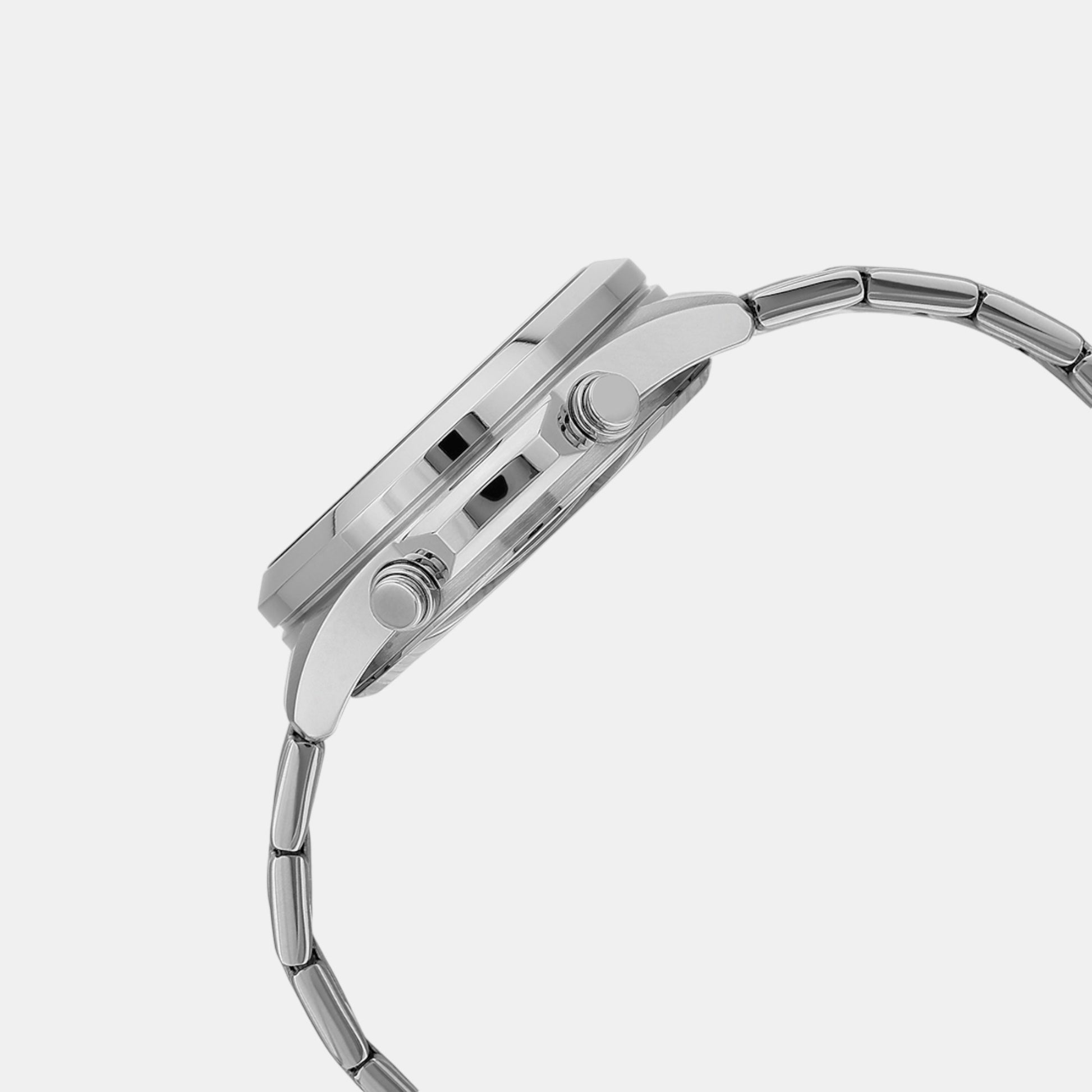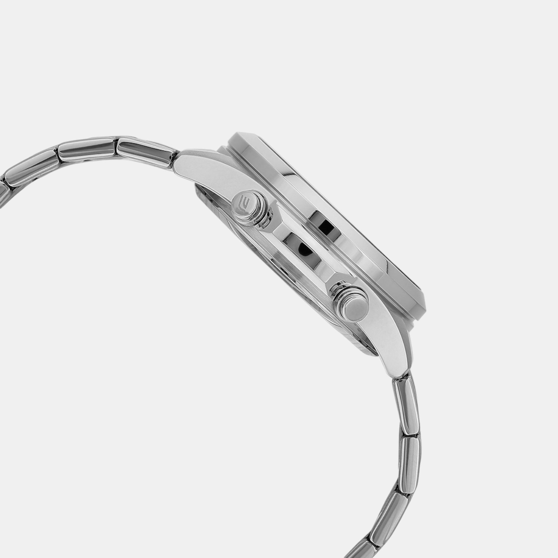 A silver stainless steel strap.