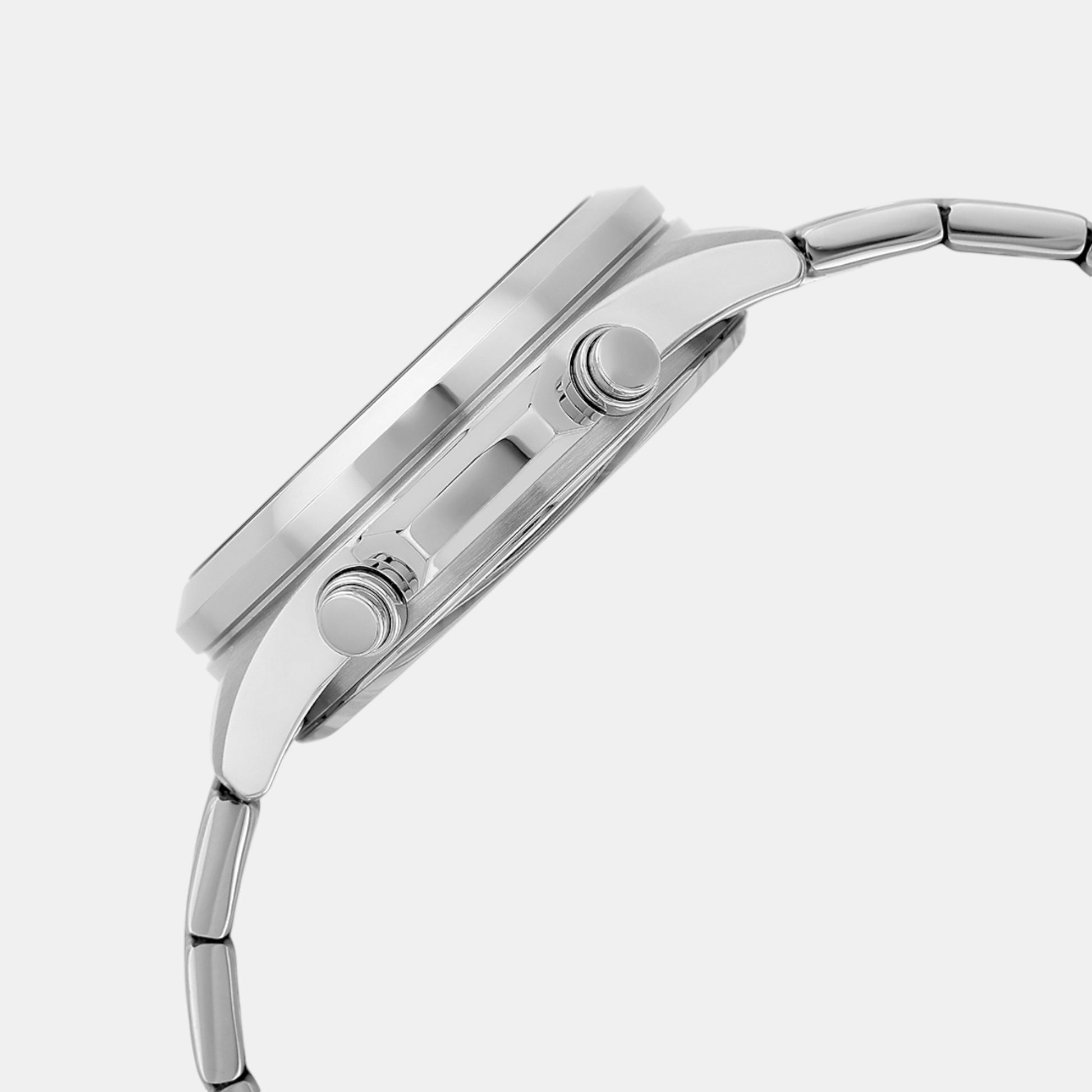 A silver stainless steel strap.
