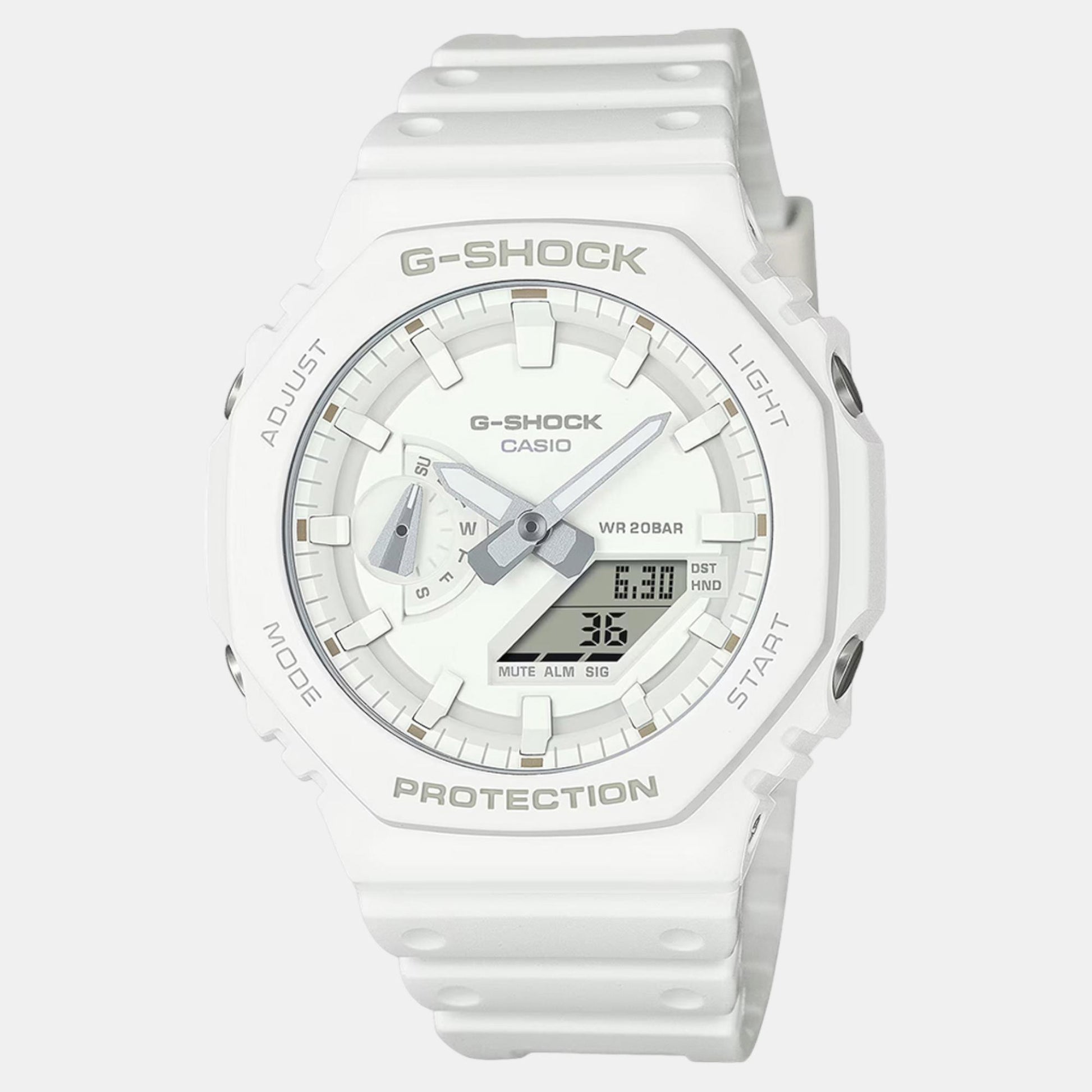 Crafted by Casio, this elegant timepiece from the G-Shock collection exemplifies refined design. It is tailored for Men, featuring a Octagon case shape for timeless appeal. The Resin strap adds strength and sophistication. With a dial size of 48.5 mm, it balances subtlety and presence on the wrist. The 11.8 mm case thickness ensures a lightweight feel. A White dial and White strap create a distinct contrast. The Pin Buckle buckle secures comfort. Driven by Quartz movement, it delivers precision through Analog-Digital display. Protected by Mineral Glass and Resin dial material. It offers 20 ATM water resistance.