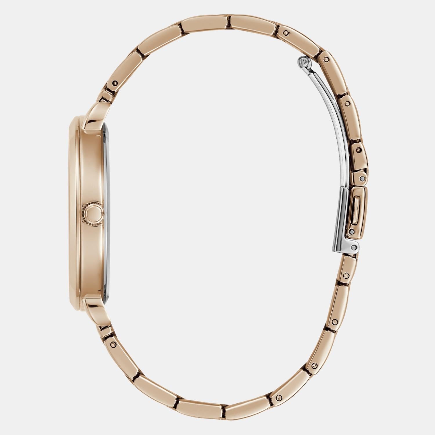 Crafted by Guess, this elegant timepiece from the Trend collection exemplifies refined design. It is tailored for Women, featuring a Round case shape for timeless appeal. The Stainless Steel strap adds strength and sophistication. With a dial size of 38 mm, it balances subtlety and presence on the wrist. The strap width of 16 mm complements its sleek profile. The 8.8 mm case thickness ensures a lightweight feel. A Rose Gold dial and Rose Gold strap create a distinct contrast. The Pilot Buckle buckle secures comfort. Driven by Quartz movement, it delivers precision through Analog display. Protected by Mineral Glass and Recycled Steel dial material. It offers 3 ATM water resistance.