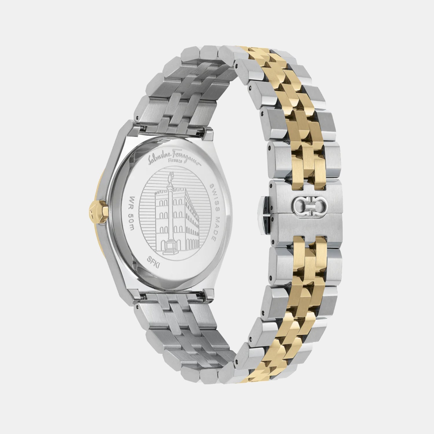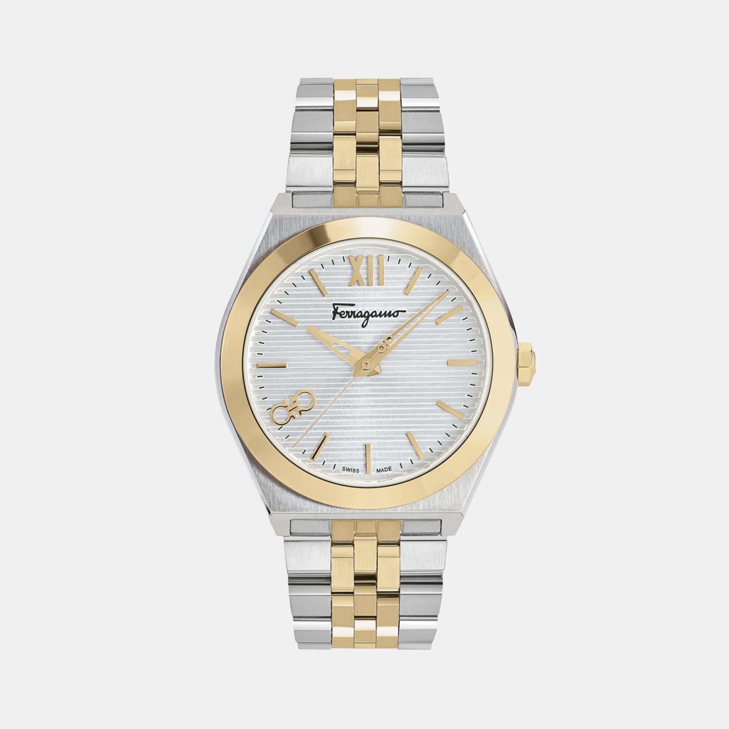 Discover Ferragamo watch for men, featuring a silver dial, a two tone strap made of stainless steel in a round case. Built with sapphire glass and stainless steel body to balance clarity and durability. Dimensions include 40 mm dial size, 20 mm strap width, 9 mm profile for comfortable wear. Key features: quartz movement, analog display, 5 atm water resistance. A secure butterfly clasp ensures a dependable fit.