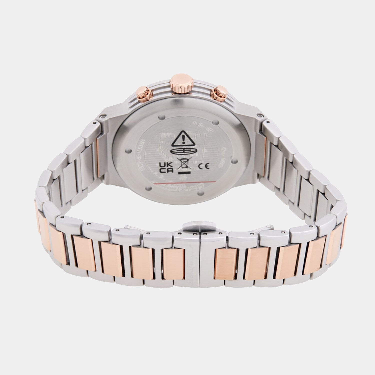 A rose gold stainless steel strap.