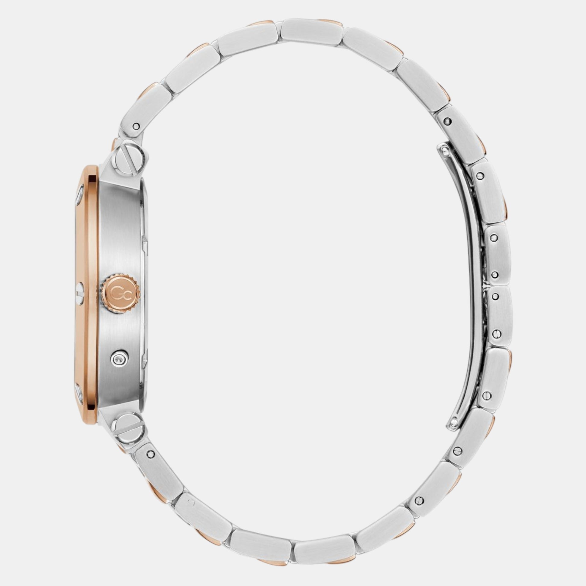 Crafted by GC, this elegant timepiece from the Aura collection exemplifies refined design. It is tailored for Women, featuring a Round case shape for timeless appeal. The Stainless Steel strap adds strength and sophistication. With a dial size of 36 mm, it balances subtlety and presence on the wrist. A White dial and Two Tone strap create a distinct contrast. The Deployment Clasp buckle secures comfort. Driven by Quartz movement, it delivers precision through Analog display. Protected by Sapphire Glass and Stainless Steel dial material. It offers 10 ATM water resistance.