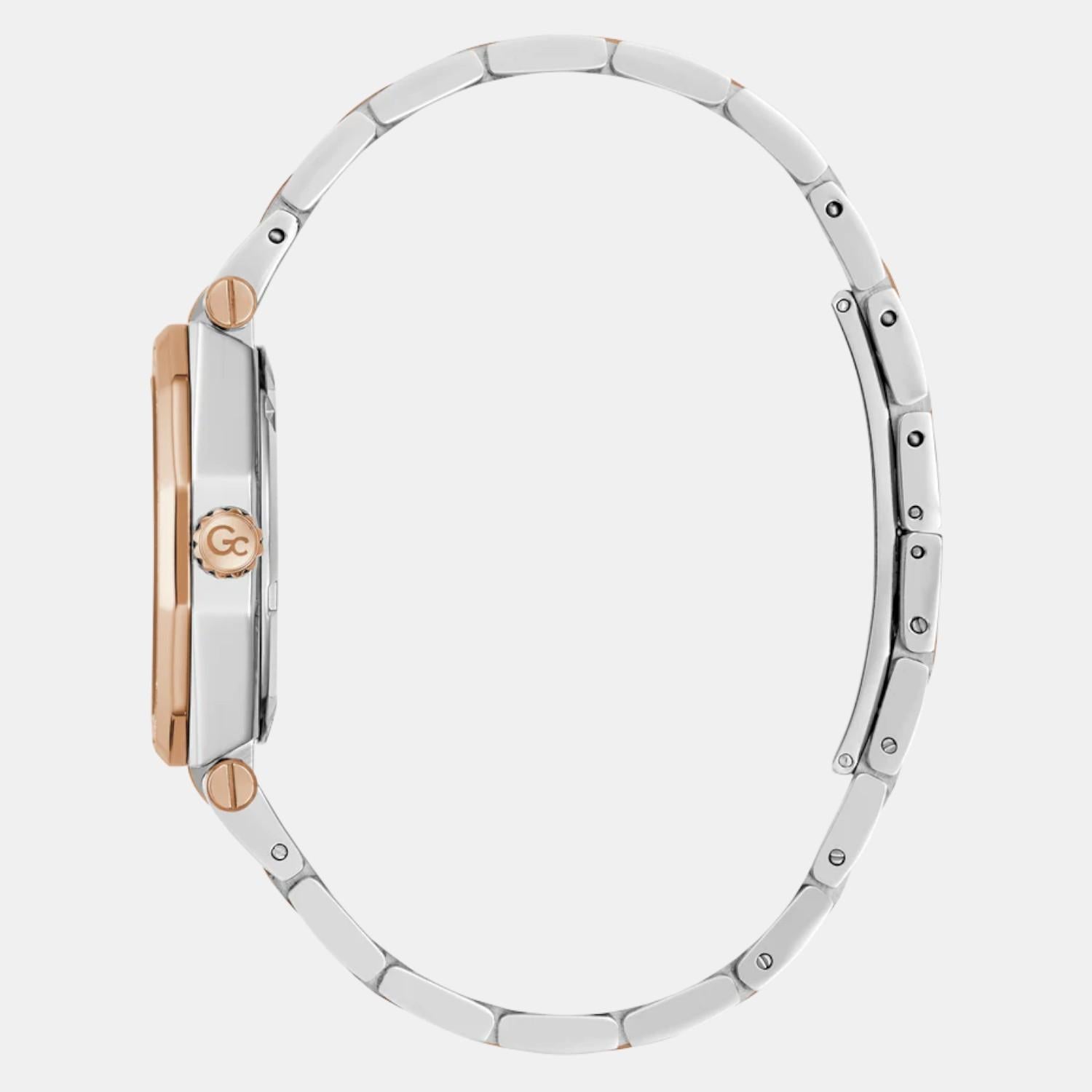 Captivate with the stunning Gc Gleam. This elegant 32mm timepiece blends silver and rose gold tones with a structured crystal-adorned top ring that sparkles with every movement. The eco-friendly white mother-of-pearl dial delivers show-stopping sophistication. Perfect for the fashion-forward woman who demands both style and distinction in her accessories.