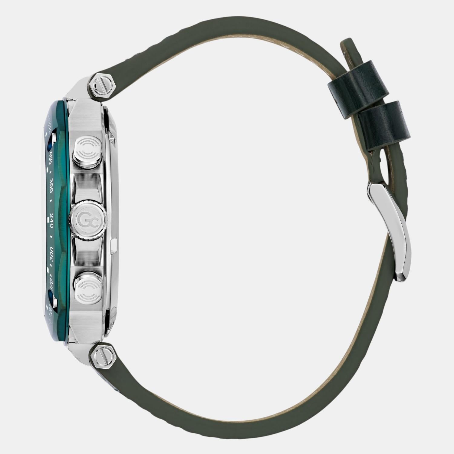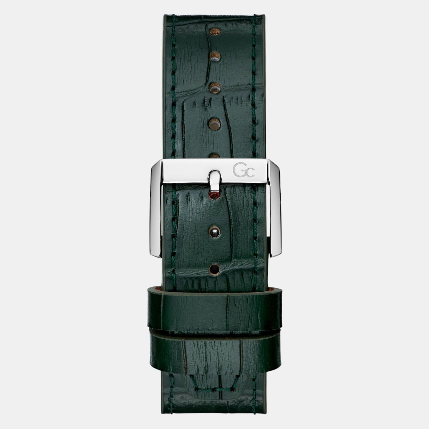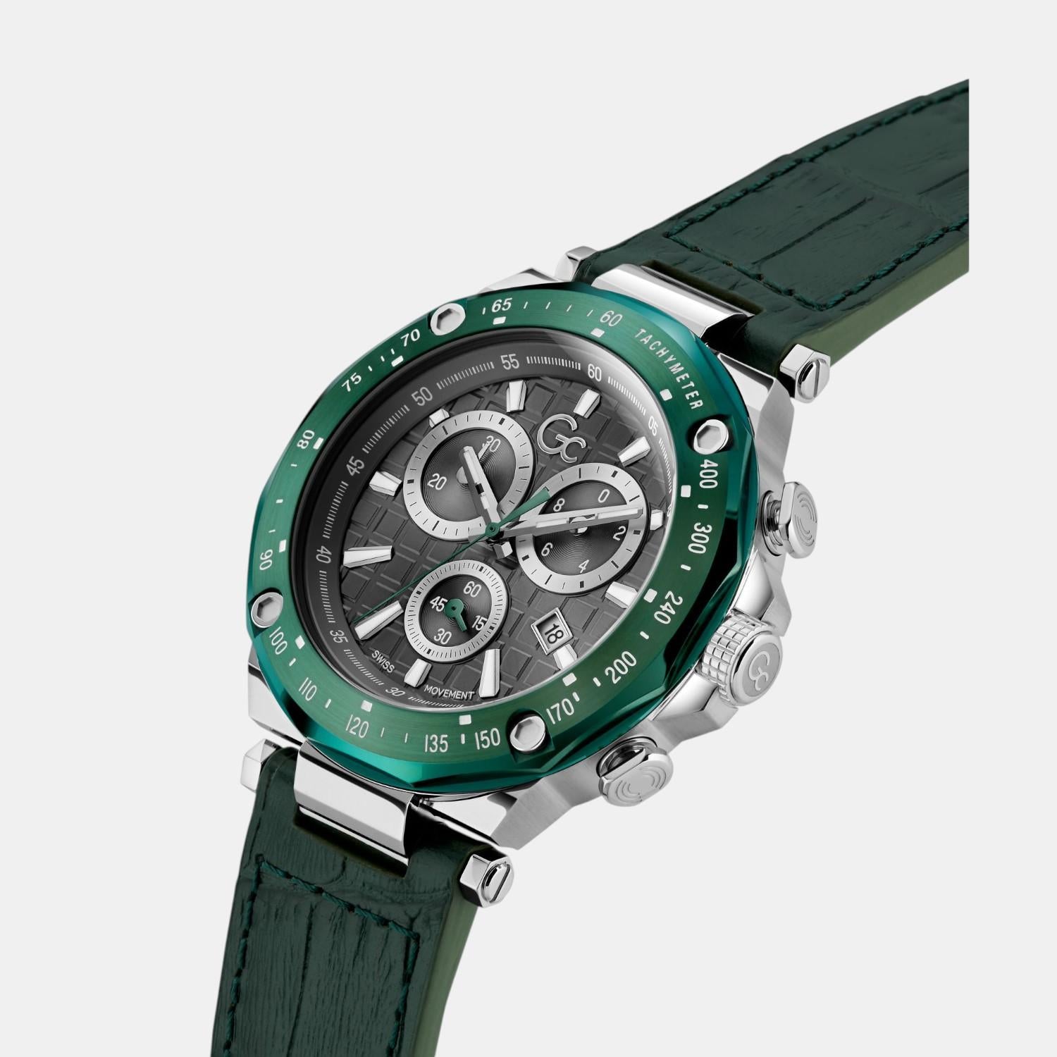 Harness the Gc sporty spirit with this trendy silver and innovative green-tone chronograph. The silhouette of this watch is strikingly masculine, thanks to the square-pattern gun dial with silver and green accents, the multi-faceted bezel enhanced with iconic screw design details, and the croco-pattern green leather strap