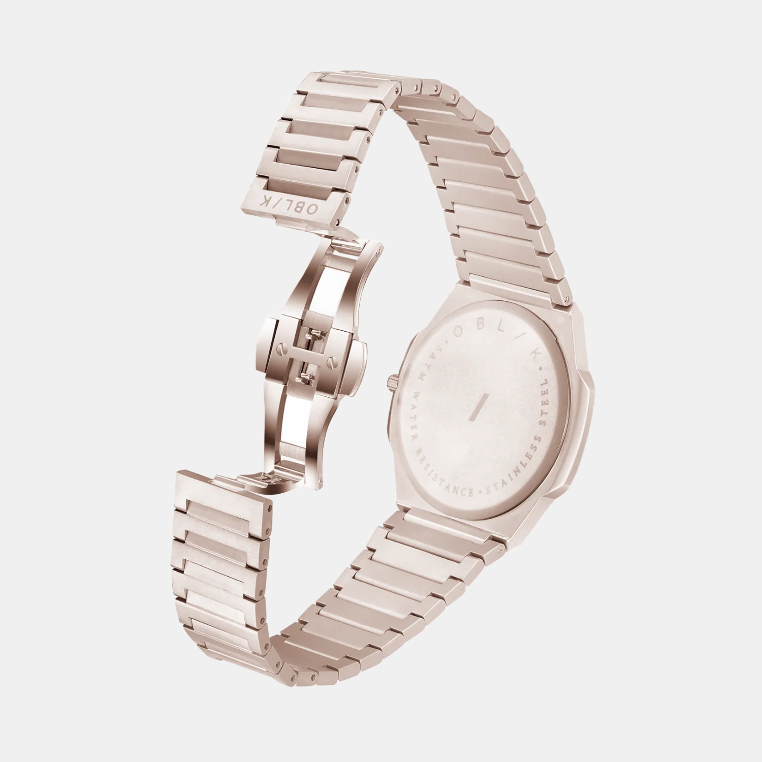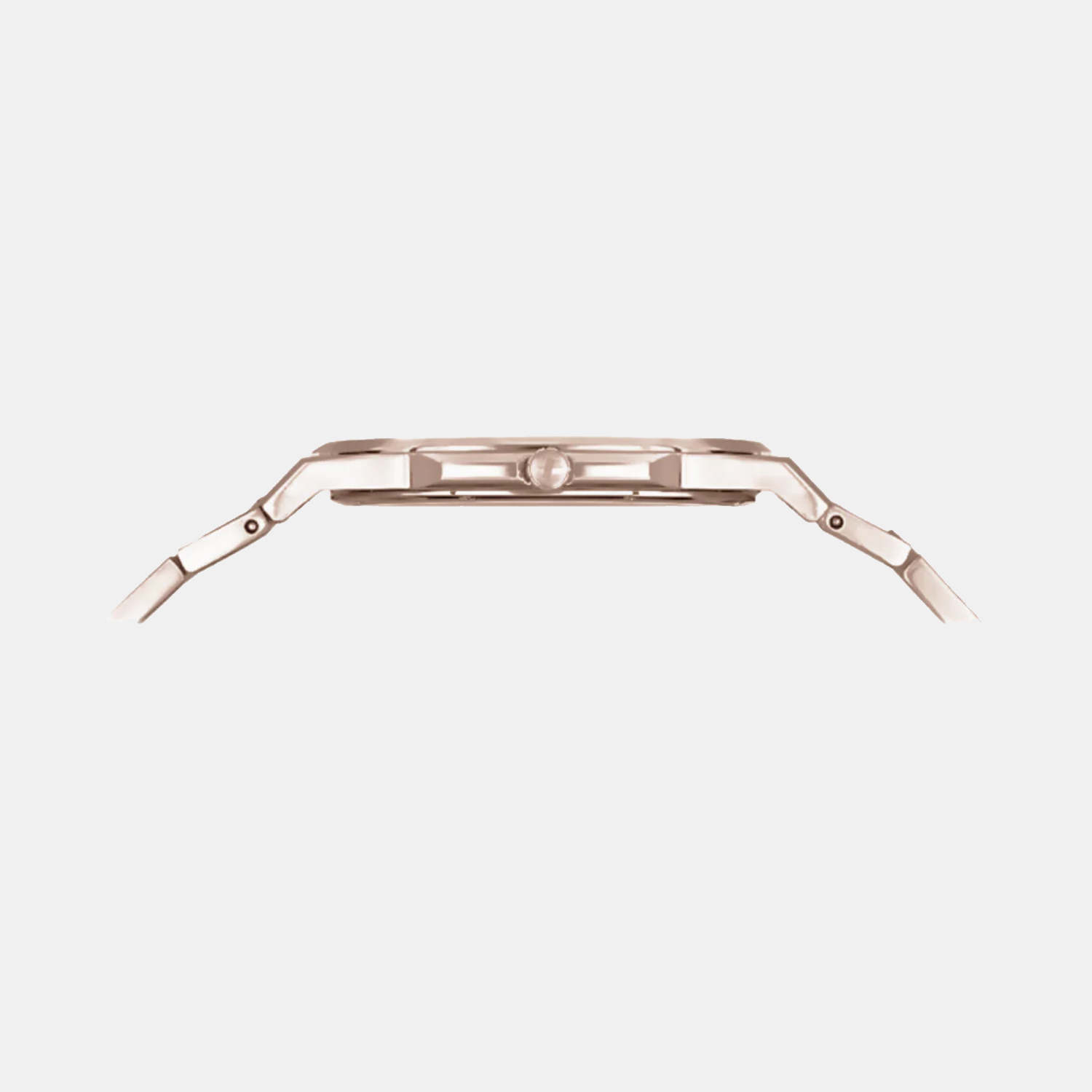 A rose gold stainless steel strap.