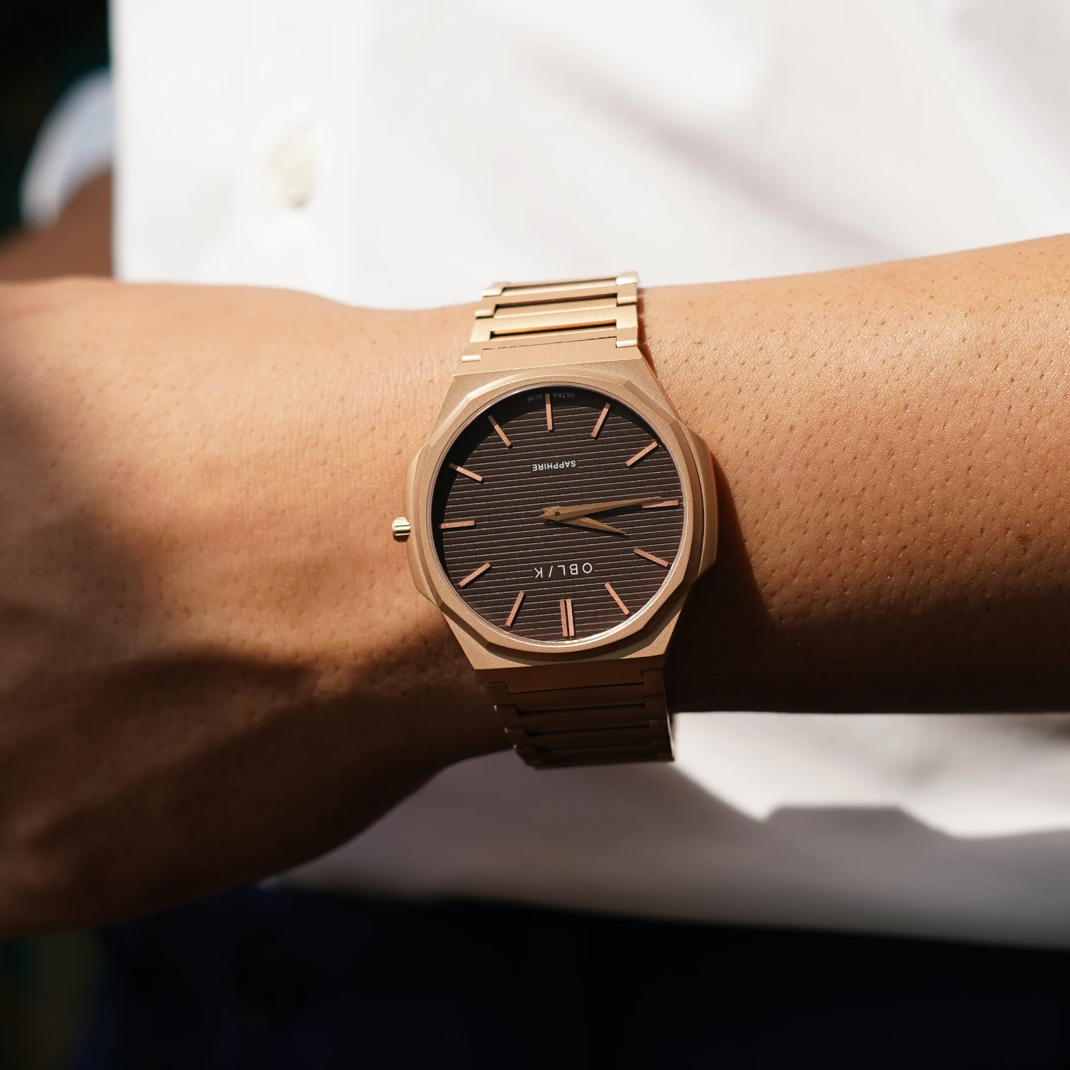 Protected by scratch-resistant Sapphire crystal and boasting 5ATM water resistance, The Blade balances sophistication with durability, defying expectations for a watch this slim. Whether you’re at the office or out for an evening, this OBLIK creation is designed to make a subtle yet bold statement.