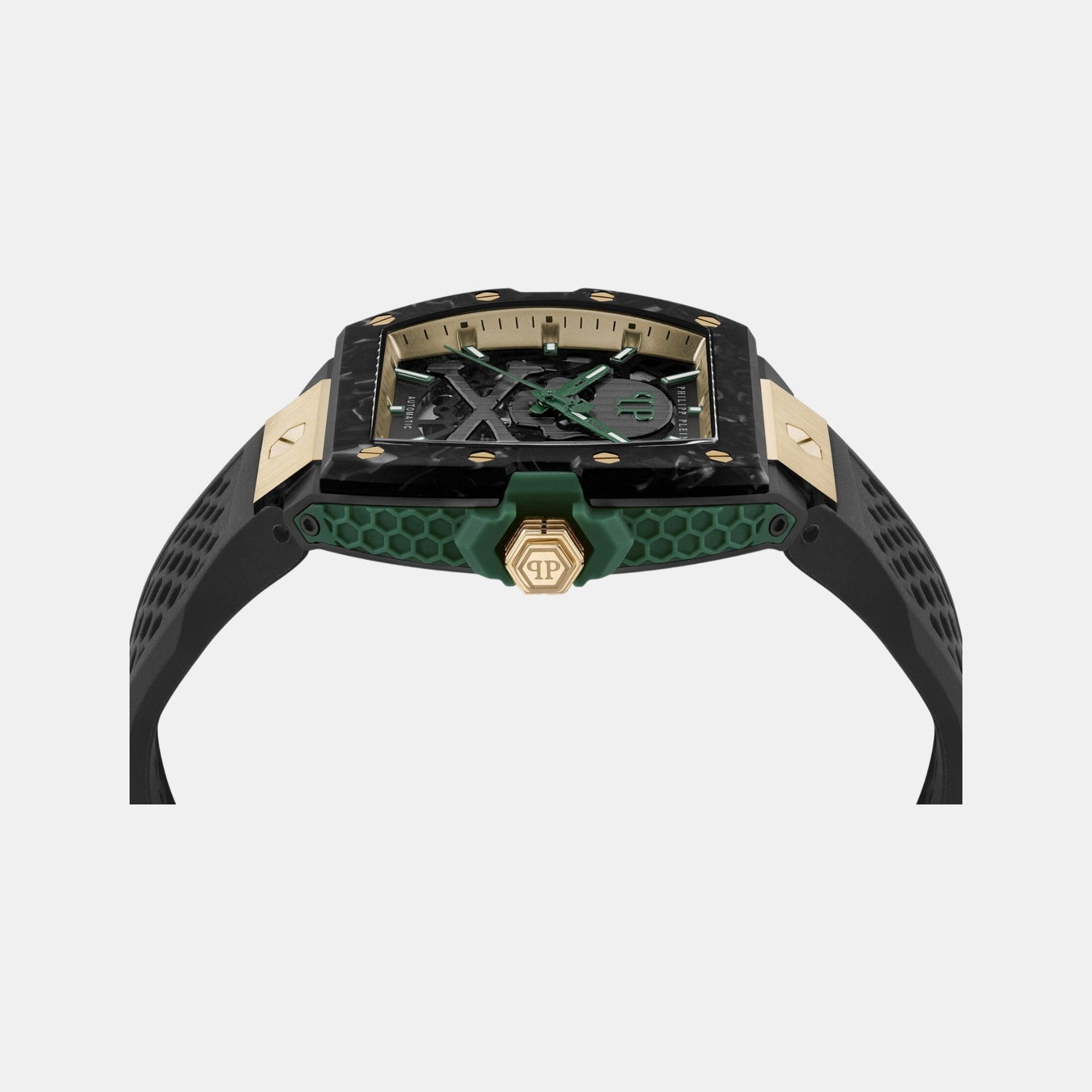 Crafted by Philipp Plein, this elegant timepiece exemplifies refined design. It is tailored for Men, featuring a Round case shape for timeless appeal. The Silicone strap adds strength and sophistication. With a dial size of 44 mm, it balances subtlety and presence on the wrist. The strap width of 22 mm complements its sleek profile. The 14.40 mm case thickness ensures a lightweight feel. A Black dial and Black strap create a distinct contrast. The Pin Buckle buckle secures comfort. Driven by Quartz movement, it delivers precision through Analog display. Protected by Mineral Glass and Stainless Steel dial material. It offers 5 ATM water resistance.