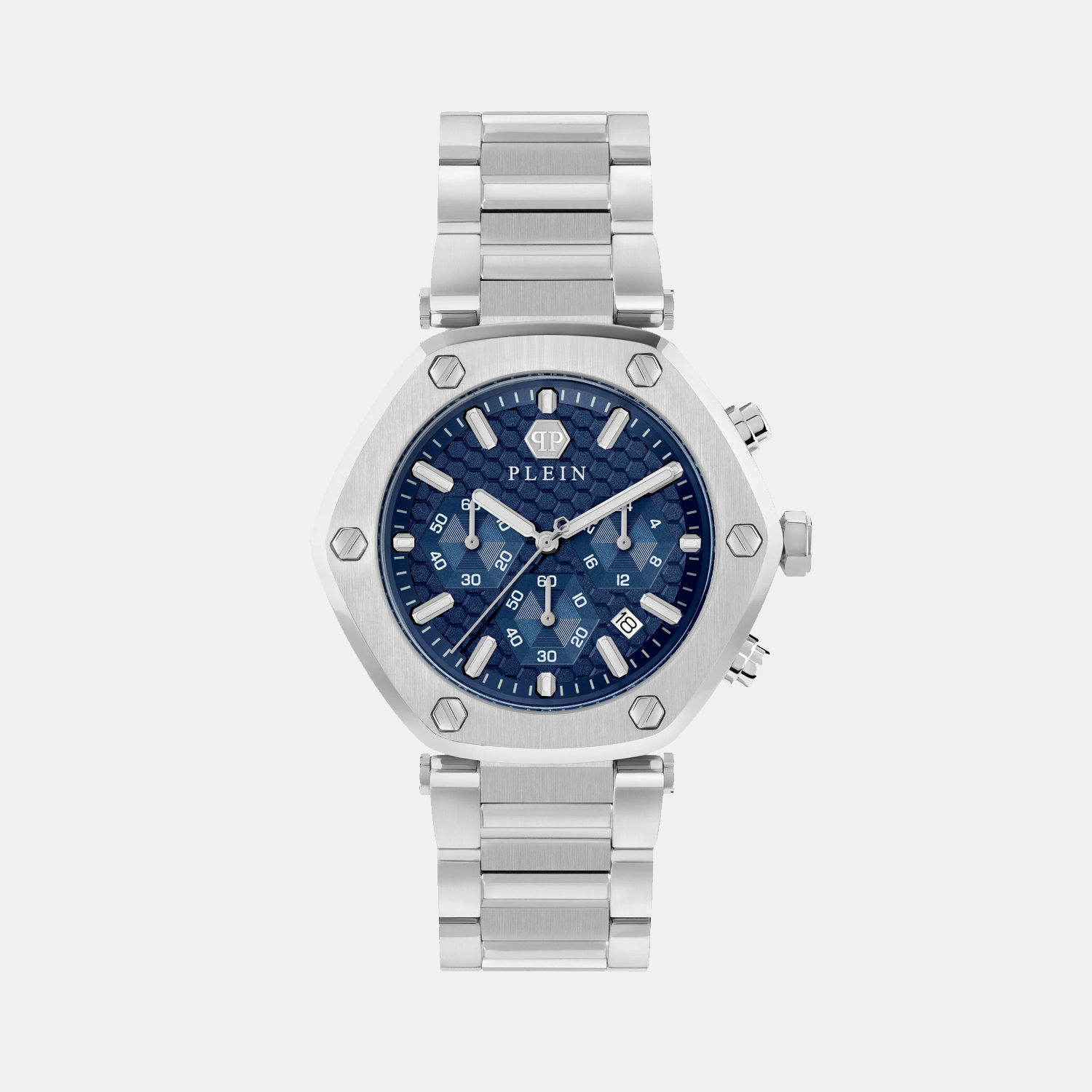 Stay updated with the latest fashion trends by owning this men's analog watch from the Hexagon Chrono collection by PHILIPP PLEIN. Operated by a quartz movement and safeguarded by a mineral glass, its blue round dial is encased in a 42 mm case. The dial features chronograph. The metal strap comes in a silver hue that further elevates the look of the watch. Moreover, it is fitted with a deployment clasp with push button clasp to ensure a secure fit on the wrist.