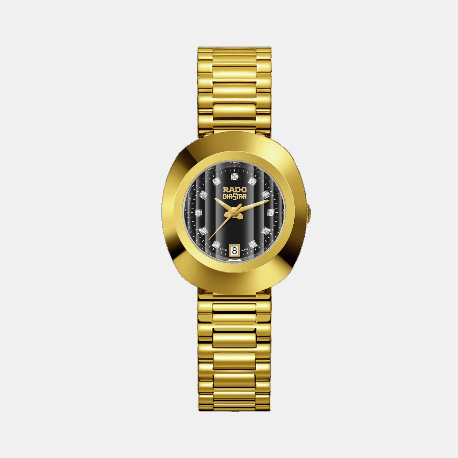 Crafted by Rado, this elegant timepiece from the DiaStar Original collection exemplifies refined design. It is tailored for Women, featuring a Oval case shape for timeless appeal. The Stainless Steel strap adds strength and sophistication. With a dial size of 27.3 mm, it balances subtlety and presence on the wrist. The 9.1 mm case thickness ensures a lightweight feel. A Black dial and Gold strap create a distinct contrast. The Foldover Clasp buckle secures comfort. Driven by Quartz movement, it delivers precision through Analog display. Protected by Sapphire Glass and Stainless Steel dial material. It offers 3 ATM water resistance.