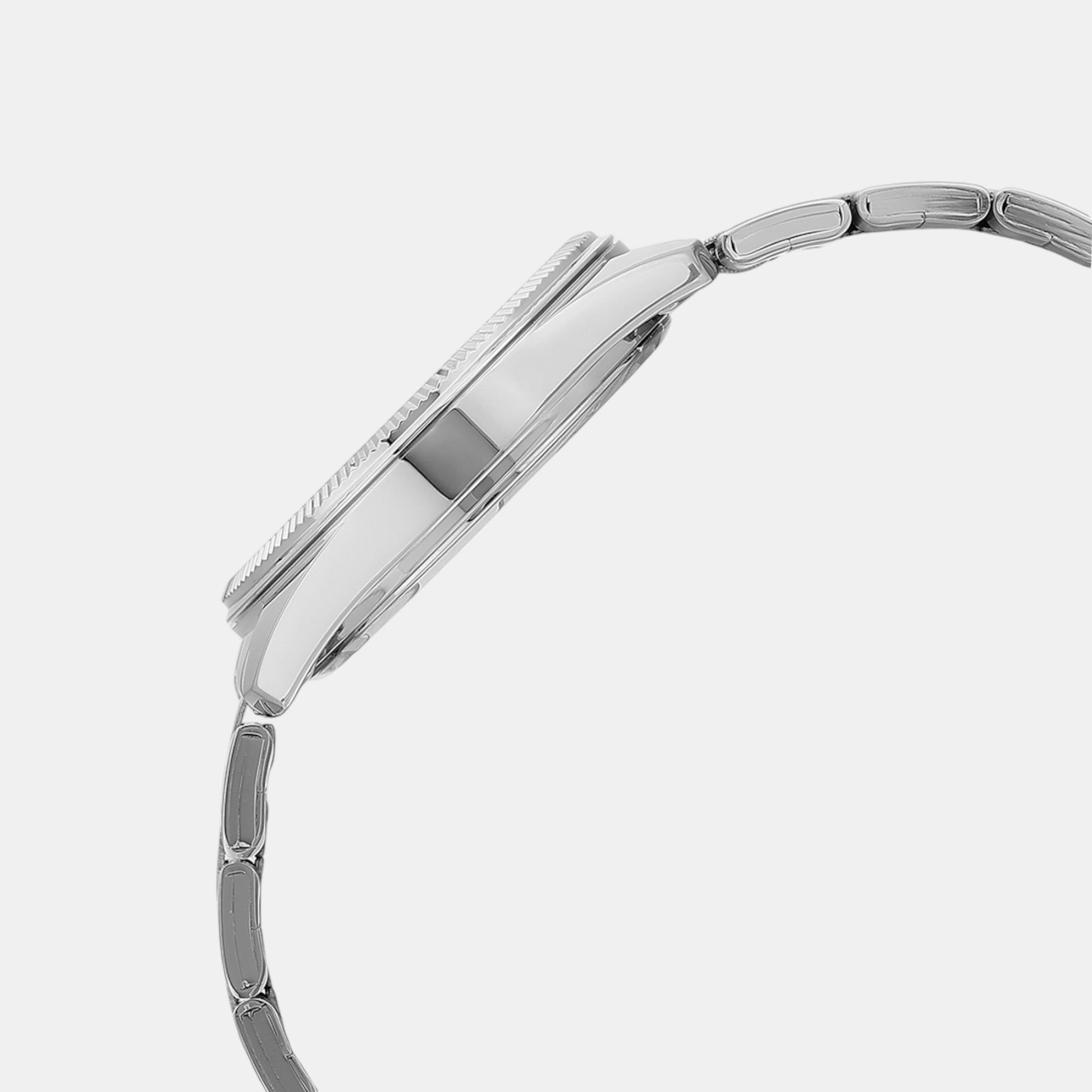 A silver stainless steel strap.