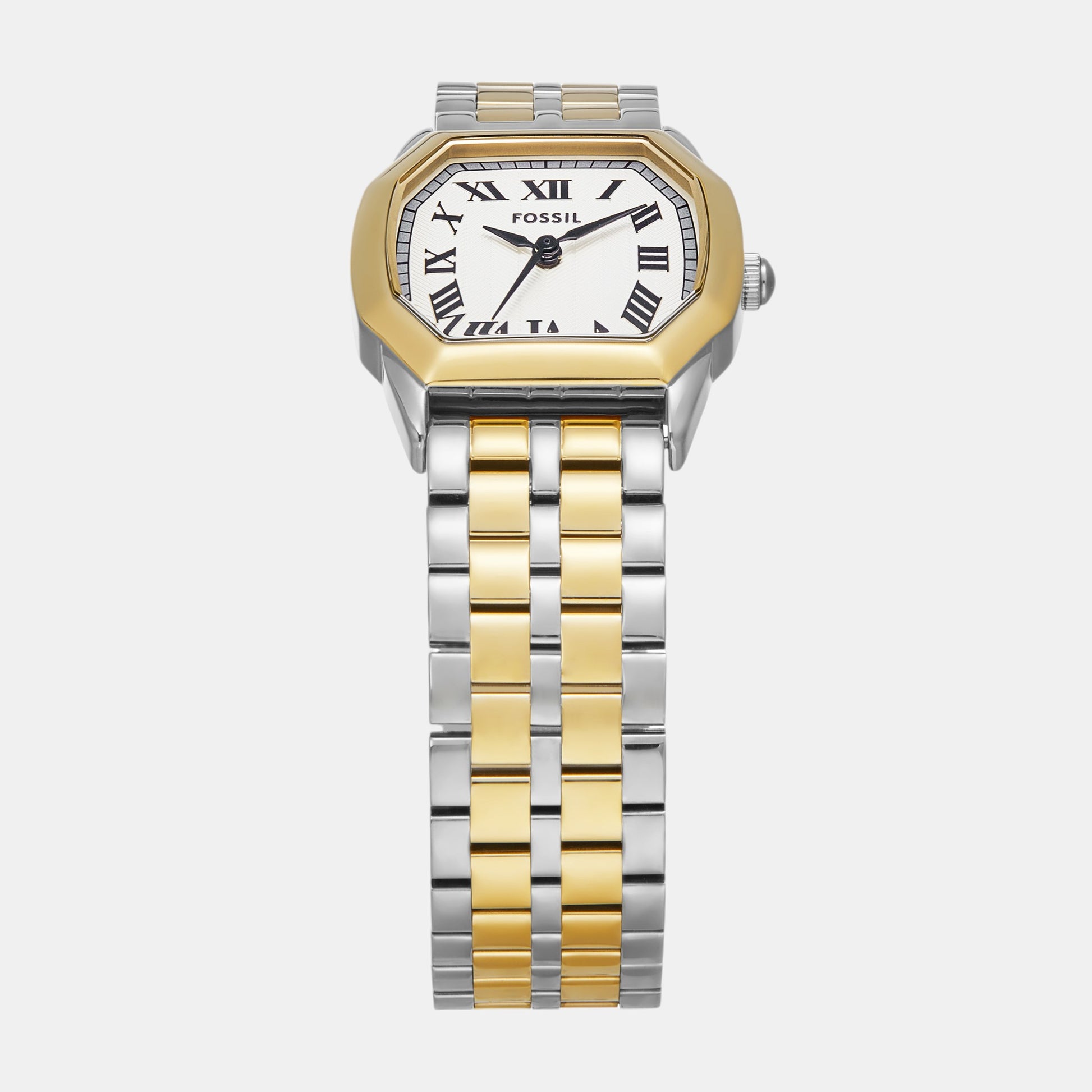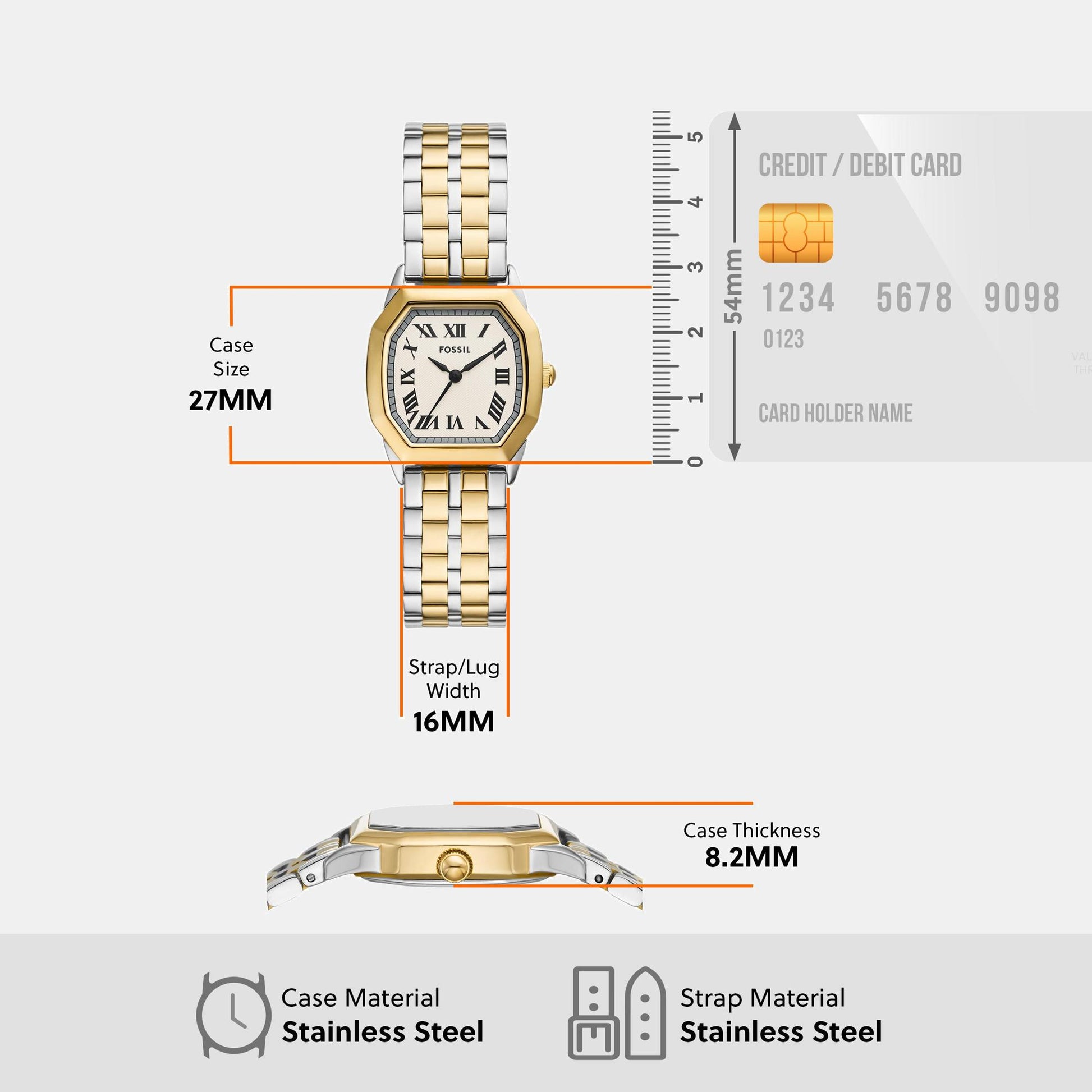 Crafted by Fossil, this elegant timepiece from the Harlow collection exemplifies refined design. It is tailored for Women, featuring a Octagon case shape for timeless appeal. The Stainless Steel strap adds strength and sophistication. With a dial size of 27 mm, it balances subtlety and presence on the wrist. The strap width of 16 mm complements its sleek profile. The 8.2 mm case thickness ensures a lightweight feel. A Cream dial and Two Tone strap create a distinct contrast. The Double Locking Foldover Clasp buckle secures comfort. Driven by Quartz movement, it delivers precision through Analog display. Protected by Mineral Glass and Stainless Steel dial material. It offers 3 ATM water resistance.