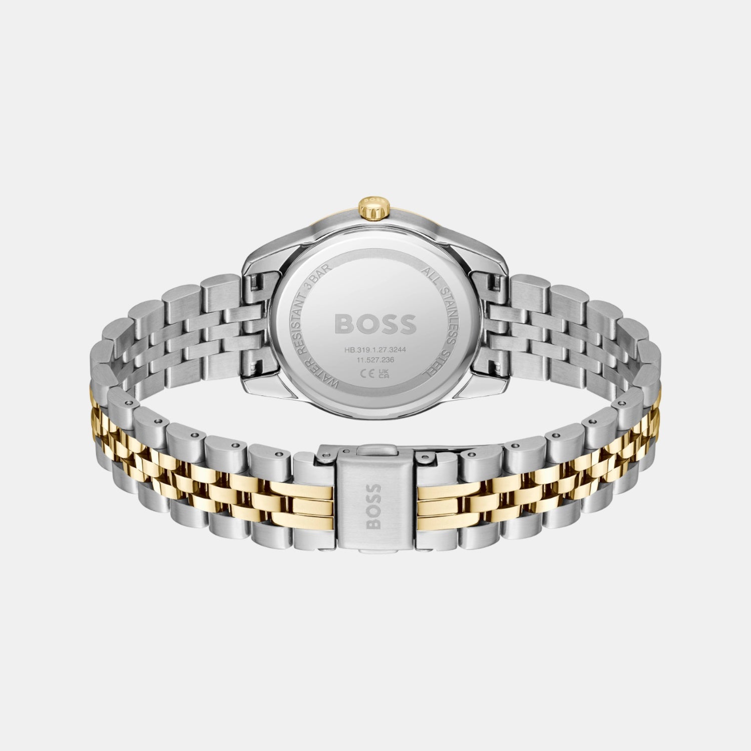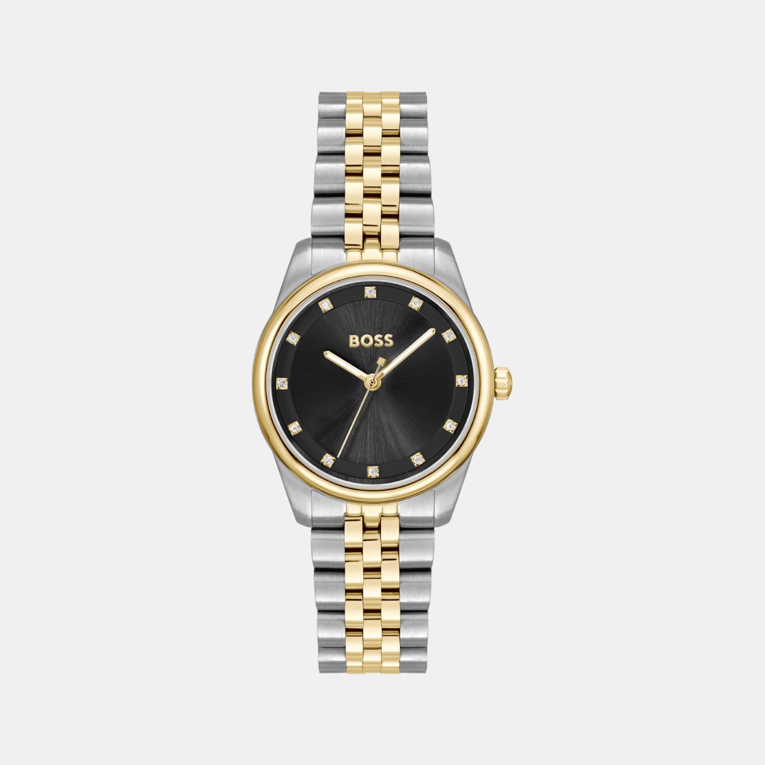 Crafted by Boss, this elegant timepiece from the Graceful Precious collection exemplifies refined design. It is tailored for Women, featuring a Round case shape for timeless appeal. The Stainless Steel strap adds strength and sophistication. A Black dial and Two Tone strap create a distinct contrast. The Push-Button Deployment buckle secures comfort. Driven by Quartz movement, it delivers precision through Analog display. Protected by Mineral Glass and Stainless Steel dial material. It offers 3 ATM water resistance.
