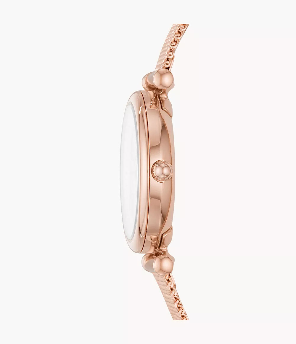 Discover Fossil watch for women, featuring a mother of pearl dial, a rose gold strap made of stainless steel in a round case. Built with mineral glass and stainless steel body to balance clarity and durability. Dimensions include 29 mm dial size, 12 mm strap width, 7 mm profile for comfortable wear. Key features: quartz movement, analog display, 5 atm water resistance. A secure folding clasp ensures a dependable fit.