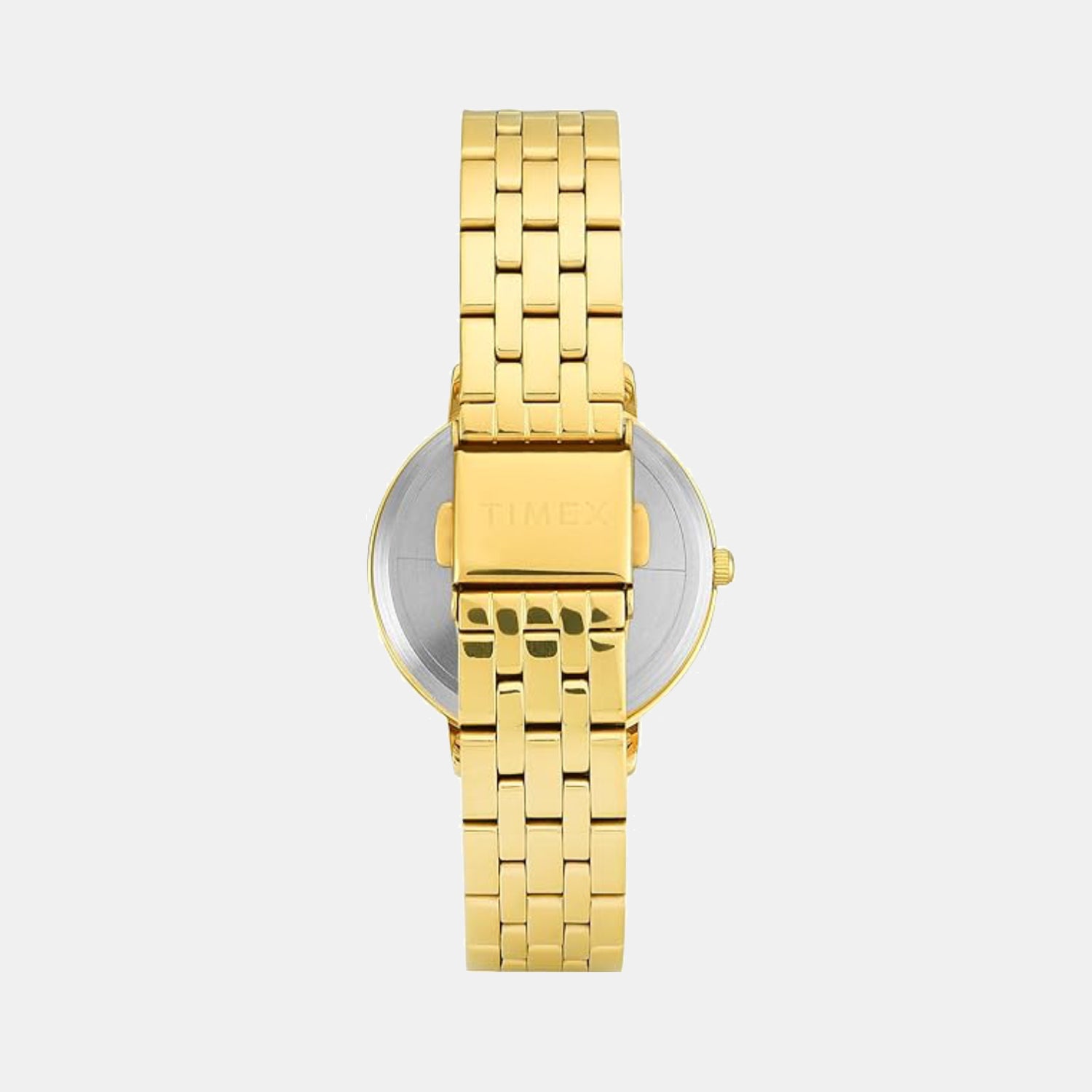 Crafted by Timex, this elegant timepiece from the Fashion collection exemplifies refined design. It is tailored for Women, featuring a Round case shape for timeless appeal. The Stainless Steel strap adds strength and sophistication. With a dial size of 34 mm, it balances subtlety and presence on the wrist. The strap width of 14 mm complements its sleek profile. The 9 mm case thickness ensures a lightweight feel. A Green dial and Gold strap create a distinct contrast. The Foldover Clasp buckle secures comfort. Driven by Quartz movement, it delivers precision through Analog display. Protected by Mineral Glass and Brass dial material. It offers 3 ATM water resistance.