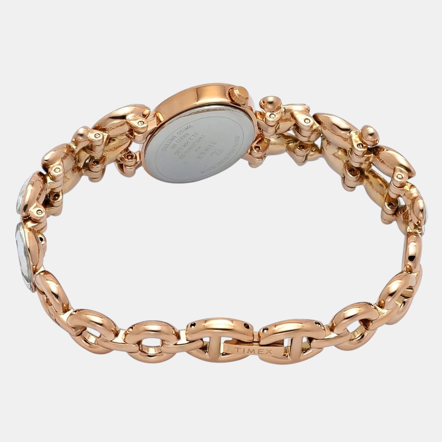 Crafted by Timex, this elegant timepiece from the Fria collection exemplifies refined design. It is tailored for Women, featuring a Oval case shape for timeless appeal. The Brass strap adds strength and sophistication. With a dial size of 26 mm, it balances subtlety and presence on the wrist. The strap width of 17 mm complements its sleek profile. The 6.6 mm case thickness ensures a lightweight feel. A Mother Of Pearl dial and Rose Gold strap create a distinct contrast. The Jewelry Clasp buckle secures comfort. Driven by Quartz movement, it delivers precision through Analog display. Protected by Mineral Glass and Brass dial material. It offers 3 ATM water resistance.