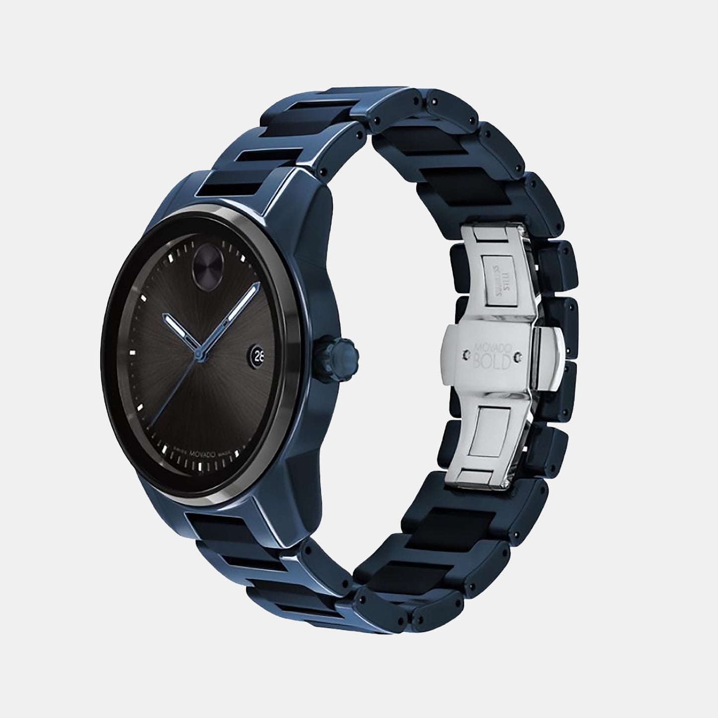 Let every minute tick in style with this Movado Bold watch. The stainless steel case houses a round black dial which features two hand movements and the Movado logo at the edge. The bold genuine leather straps add to the luxe look of the watch.Dial Color:Black,Strap Color:Blue,Code:3600728