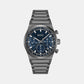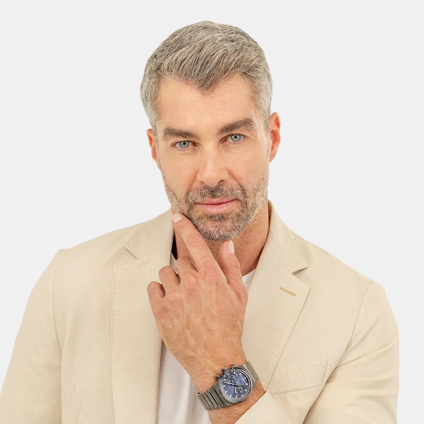 Housed in a 41 mm stainless steel case, the watch features a textured dial in a deep blue tone, paired with three silver-toned subdials that serve its chronograph functions. Baton-style markers and slender hands enhance readability while maintaining a clean, refined look. A push-button deployment clasp secures the stainless steel bracelet, offering comfort with a tailored feel. With water resistance up to 5 ATM, it’s ready for daily wear without hesitation.
