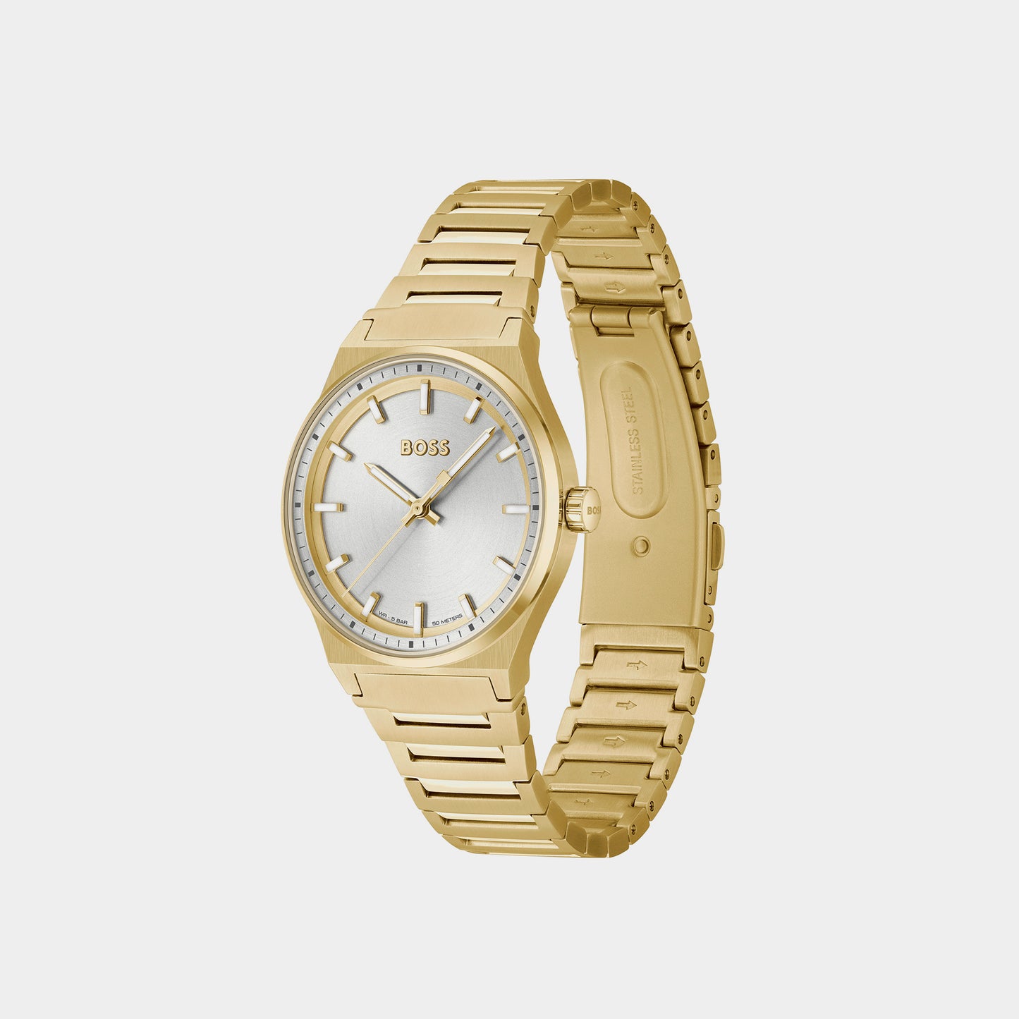 Discover Boss watch for women, featuring a silver dial, a gold strap made of stainless steel in a round case. Built with mineral glass and stainless steel body to balance clarity and durability. Key features: quartz movement, analog display, 5 atm water resistance. A secure push-button deployment ensures a dependable fit.