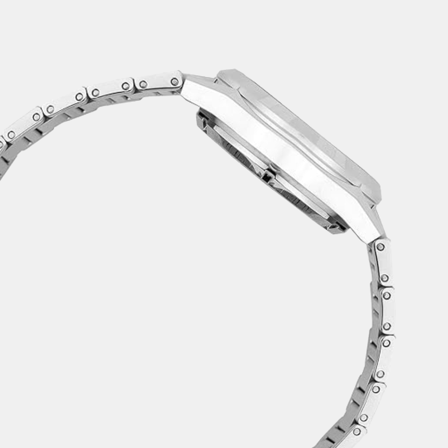 A silver stainless steel strap.