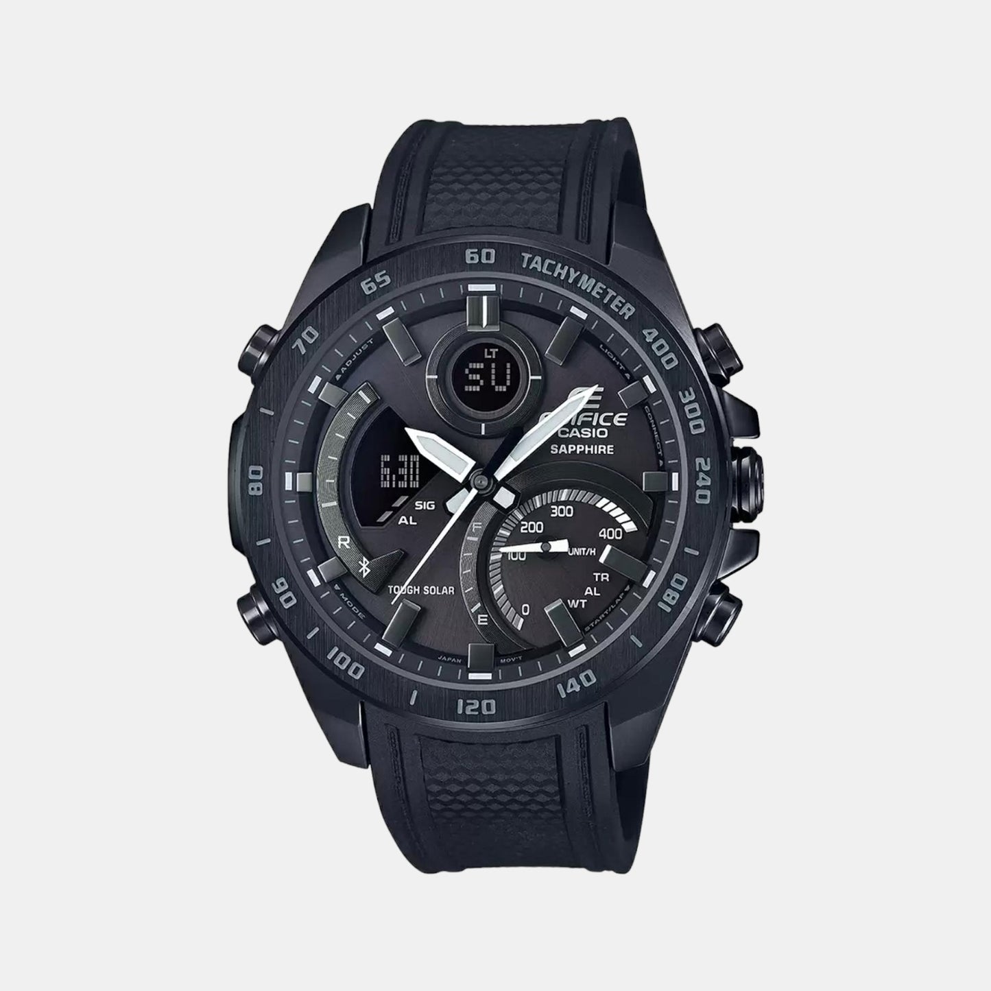 Case / bezel material: Stainless steel Resin Band Mineral Glass Tachymeter Black ion plated case 100-meter water resistance Tough Solar (Solar powered) Double LED light LED light for the face (Full auto LED light, Super illuminator, selectable illumination duration (1.5 seconds or 3 seconds), afterglow) LED backlight for the digital display (Full auto LED light, Super illuminator, selectable illumination duration (1.5 seconds or 3 seconds), afterglow) Mobile link (Wireless linking using Bluetooth) World time 39 time zones* (39 cities + coordinated universal time), daylight saving on/off, auto summer time (DST) switching, Home city/World time city swapping *May be updated when connected to a smartphone. 1/1000-second stopwatch Measuring capacity: 00'00''000~59'59''999 (for the first 6Xinutes) 1:00'00''0~23:59'59''9 (after 6Xinutes) Measuring unit: 1/1000 second (for the first 6Xinutes) 1/10 second (after 6Xinutes) Measuring modes: Elapsed time, lap time Recorded data: Up to 200 records (measurement lap times) Other: Speed (0 tX00 units/hour) Countdown timer Measuring unit: 1/10 second Countdown range:X hours Countdown start time setting range: 1 second toX hours (1-second increments, 1-minute increments and 1-hour increments) 5 multi-function alarms (with daily, 1 time, schedule) Hourly time signal Hand shift feature (Hands move out of the way to provide an unobstructed view of digital display contents) Battery level indicator Full auto-calendar (to year 2099) 12X-hour format Button operation tone on/off Power Saving (display goes blank and hands stop to save power when the watch is left in the dark) Regular timekeeping Analog: 3 hands (hour, minute (hand moves every 10 seconds), second), 1 dial (speed indicator) Digital: Hour, minute, second, pm, month, date, day Accuracy: 15 seconds per month (wino mobile link function) ApproX battery operating time: 6Xnths on rechargeable battery (operation period winormal use without eXosure to light after charge) 19 months on rechargeable battery (operation period when stored in total darkness with the power save function on after full charge) Size of case : 51.5X8X3.9mm Total weight : 100g