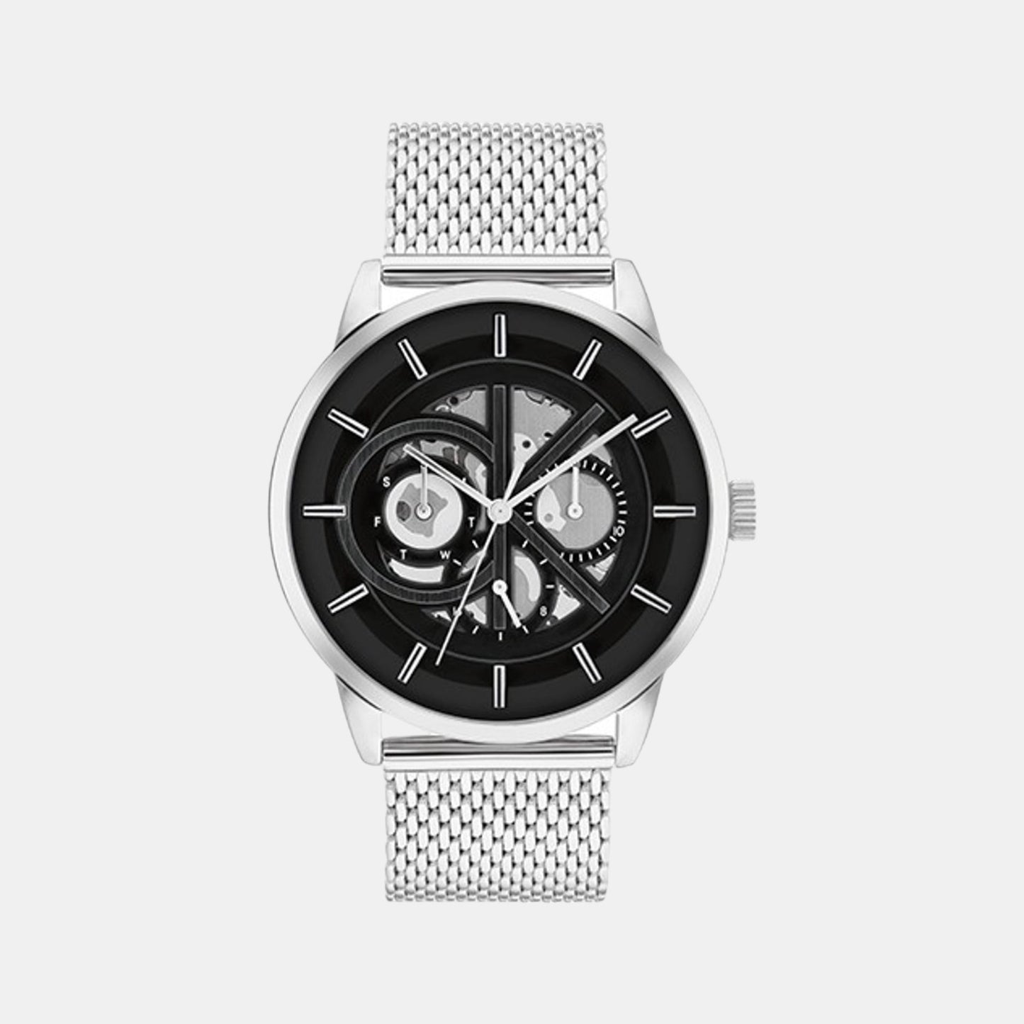 Modern Skeleton Men Quartz Black Dial Multi-Function Stainless Steel Watch 25200213
