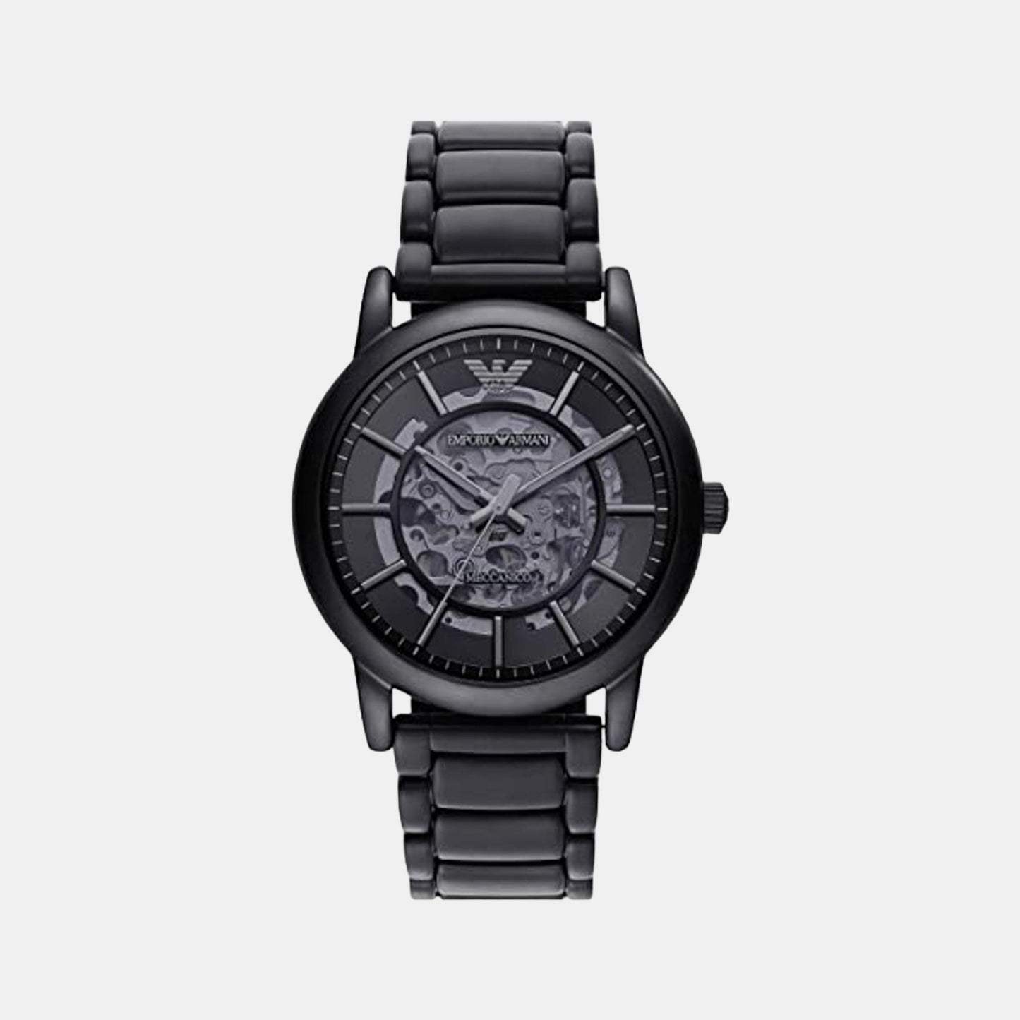 This 43 mm watch features a matte dial with stick indexes, skeleton automatic movement and dark metal bracelet with a push button deployment clasp. The skeleton analogue dial is protected beneath a mineral crystal glass while power is generated by the automatic movement.