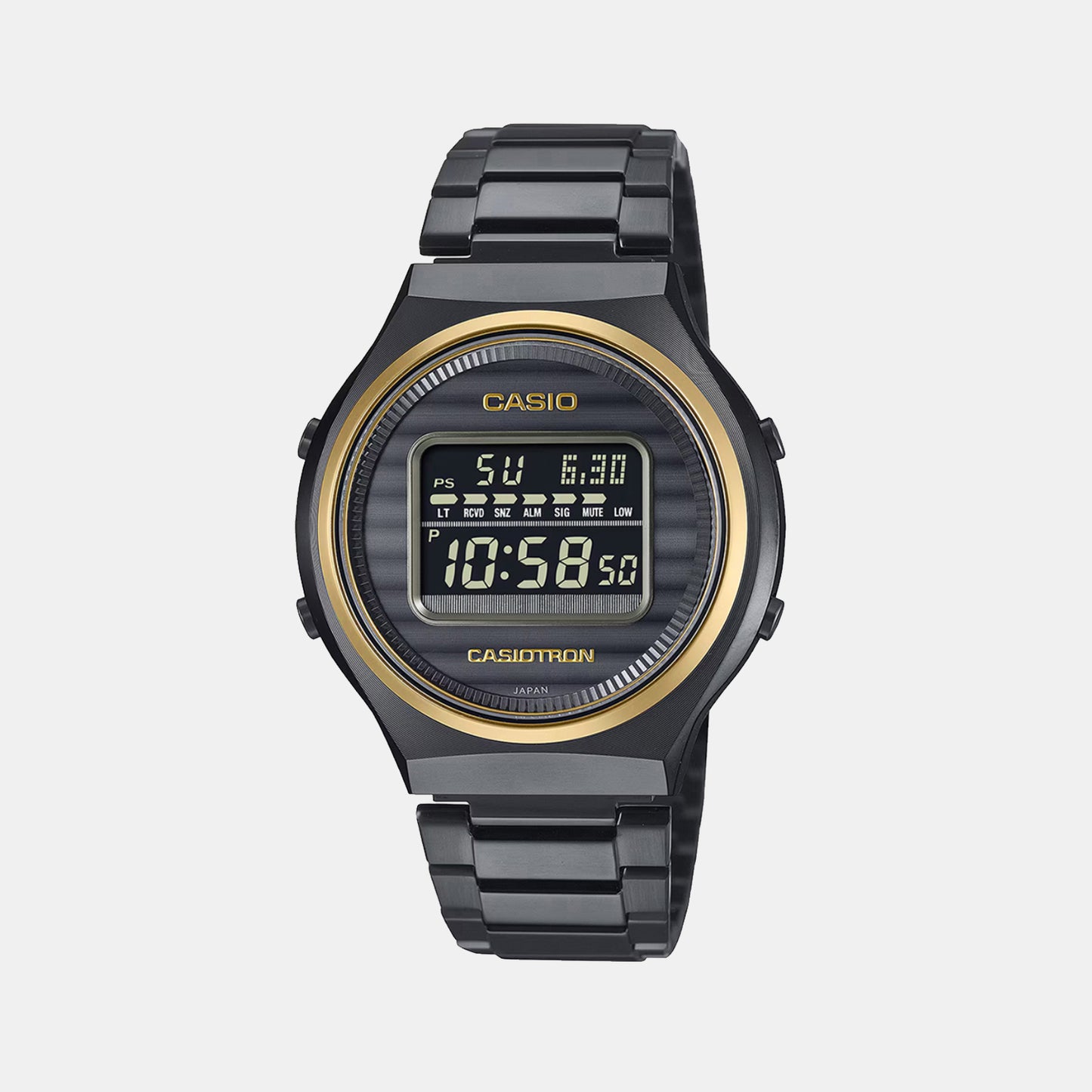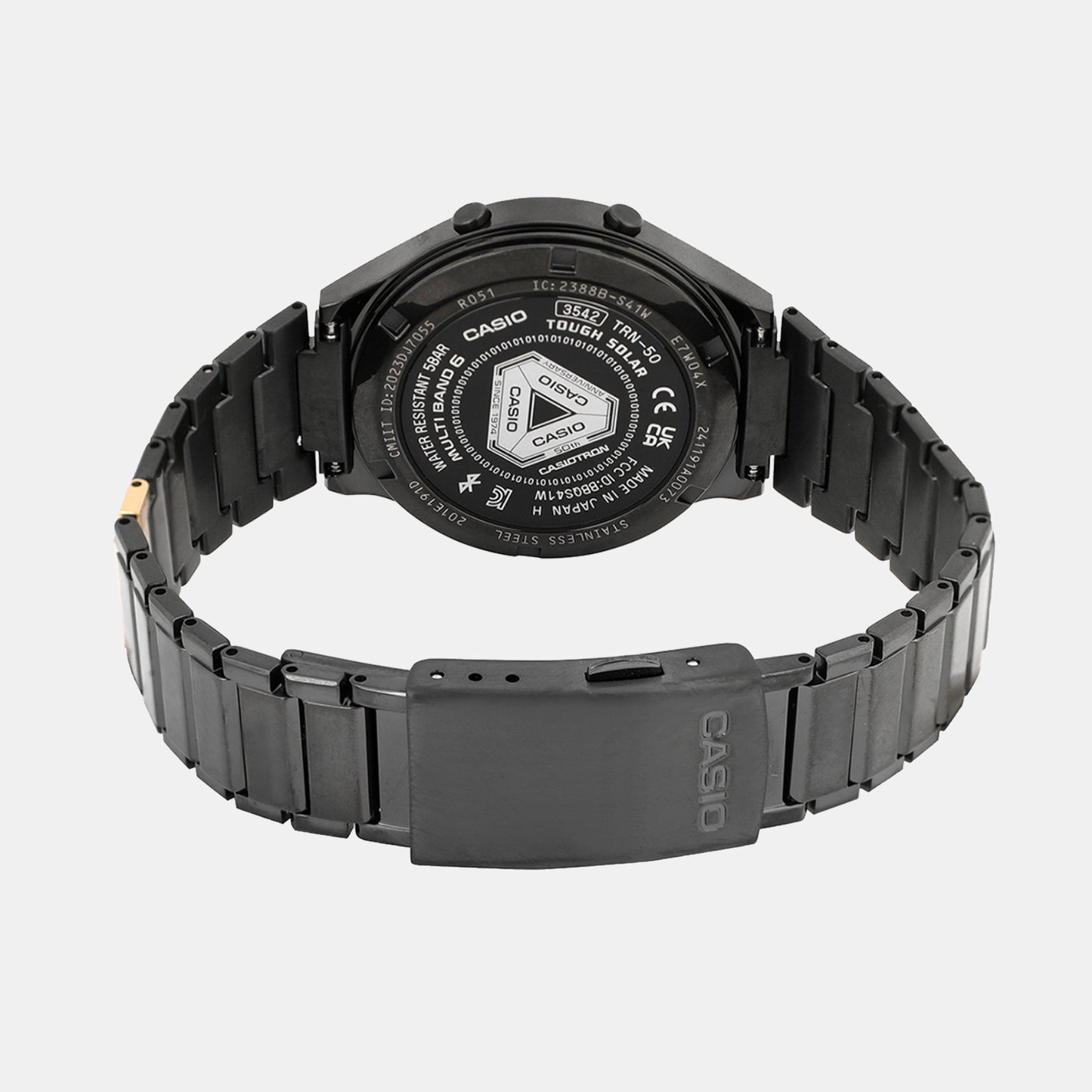 Celebrate 50 years of Casio watches with a commemorative Casiotron timepiece that sparkles with Casio passion for new value and constant innovation. The Casiotron TRN-50ZE embodies the spirit of craftsmanship inspired by the excitement of “making something from nothing” — the thrill of going from “0” to “1” — the total creativity that brought the world the very first Casiotron in 1974. The first wristwatch released by Casio, the Casiotron was also the world’s first digital watch with an automatic calendar function. The 50th anniversary TRN-50ZE pays homage to the original, but with a black and gold color scheme that evokes the first flicker of light, that spark of innovative craftsmanship, where the creation of new value begins. The gold color of the bezel, logos, and other elements complements the sophisticated look of the dial and dial ring for a luxe design that makes it easy to read the time. Separate hairline and mirror finishes on the stainless-steel band add sophisticated textural appeal. The single gold-color link on an otherwise black ion-plated band is a special touch that catches the eye, flickering like a light that breaks the darkness and illuminates the path to value innovation. The link is also laser engraved with “50th ANNIVERSARY.” The case back*1 employs special design features worthy of a limited-edition anniversary model. These include an engraved “CASIO 50th ANNIVERSARY” mark encircled by 0’s and 1’s, capturing the Casio devotion to the art of making something from nothing. The watch comes in special environmentally responsible packaging made with recycled materials, including a cotton pouch for storing accessories. *1 The orientation of the case back may vary from watch to watch due to details of the manufacturing process. Note: Graphics may vary from actual appearance.