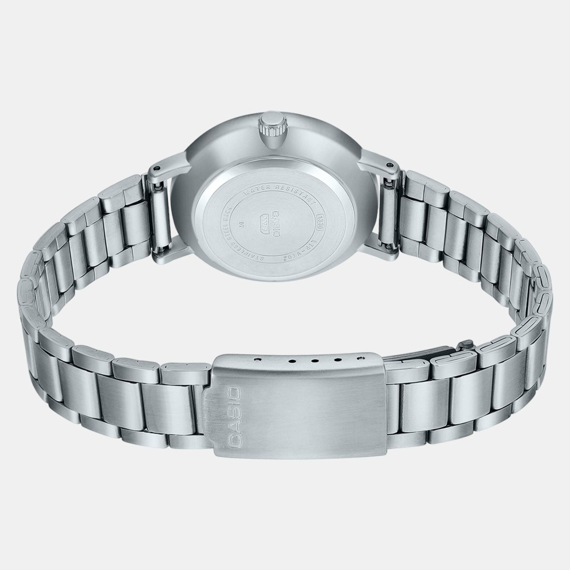 A silver stainless steel strap.