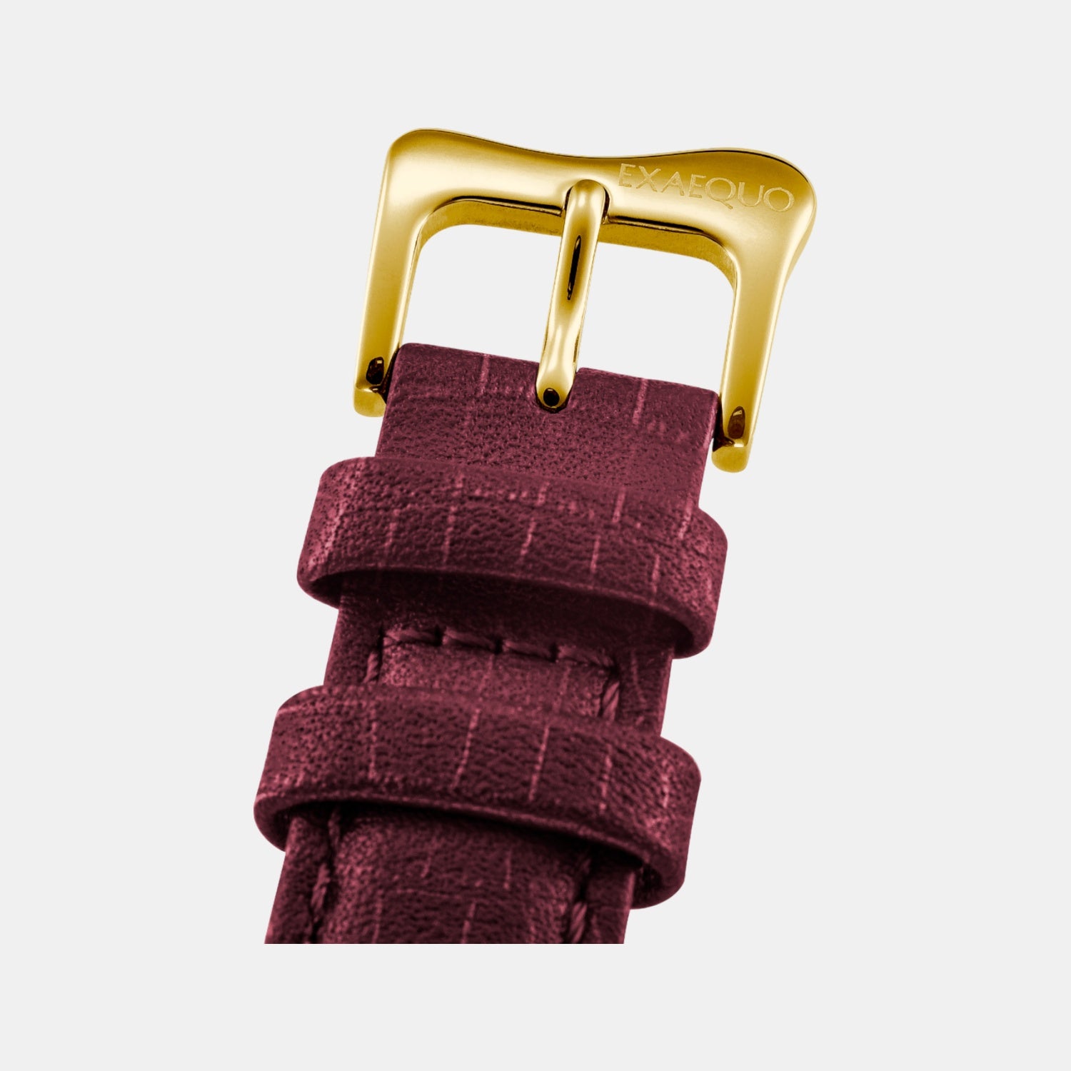 Crafted by Exaequo, this elegant timepiece from the Classic collection exemplifies refined design. It is tailored for Unisex, featuring a Kidney Shaped case shape for timeless appeal. The Leather strap adds strength and sophistication. With a dial size of 47 x 28 mm, it balances subtlety and presence on the wrist. The strap width of 15 mm complements its sleek profile. The 10 mm case thickness ensures a lightweight feel. A Burgundy dial and Burgundy strap create a distinct contrast. The Pin Buckle buckle secures comfort. Driven by Quartz movement, it delivers precision through Analog display. Protected by Dome Glass Plastic Lens and Stainless Steel dial material. It offers 3 ATM water resistance.
