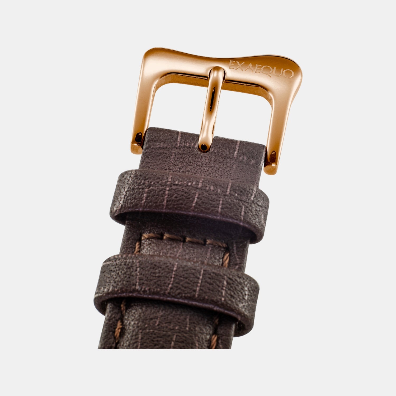 Crafted by Exaequo, this elegant timepiece from the Classic collection exemplifies refined design. It is tailored for Unisex, featuring a Kidney Shaped case shape for timeless appeal. The Leather strap adds strength and sophistication. With a dial size of 47 x 28 mm, it balances subtlety and presence on the wrist. The strap width of 15 mm complements its sleek profile. The 10 mm case thickness ensures a lightweight feel. A White dial and Brown strap create a distinct contrast. The Pin Buckle buckle secures comfort. Driven by Quartz movement, it delivers precision through Analog display. Protected by Dome Glass Plastic Lens and Stainless Steel dial material. It offers 3 ATM water resistance.