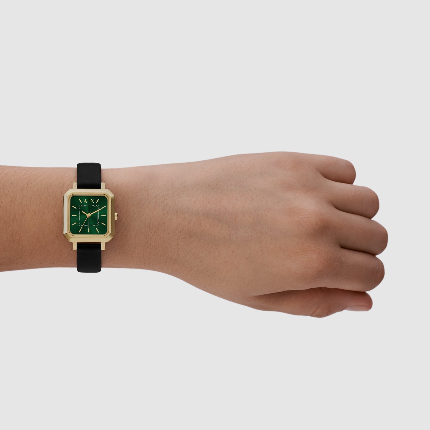 Armani Exchange's 27mm watch features a green sunray dial, three-hand movement and black leather strap.Dial Color:Green,Strap Color:Black,Code:AX5723