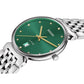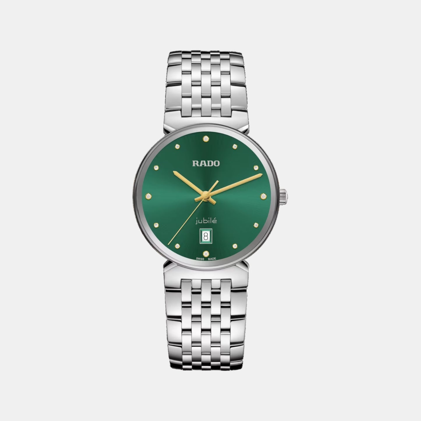 The harmonious design of the Rado Florence calls to mind the elegant domes and towers of the city from which the collection takes its name. Powered by a reliable three-hand Quartz Rado calibre R073 movement, this watch ensures greater accuracy and resistance to shocks. The 38 mm watch has an edge-to-edge-bevelled, curved sapphire crystal. The watch boasts a polished stainless steel case, crown, bezel and case back. The bracelet made of polished stainless steel completes the overall appearance of this classic timepiece. The green dial with 12 diamonds, emphasised with the silver coloured printed “jubilé” logo, matches perfectly with the yellow gold coloured hands. The watch is water resistant down to 50 m and is also available in S size, which makes it an ideal couples’ watch.
