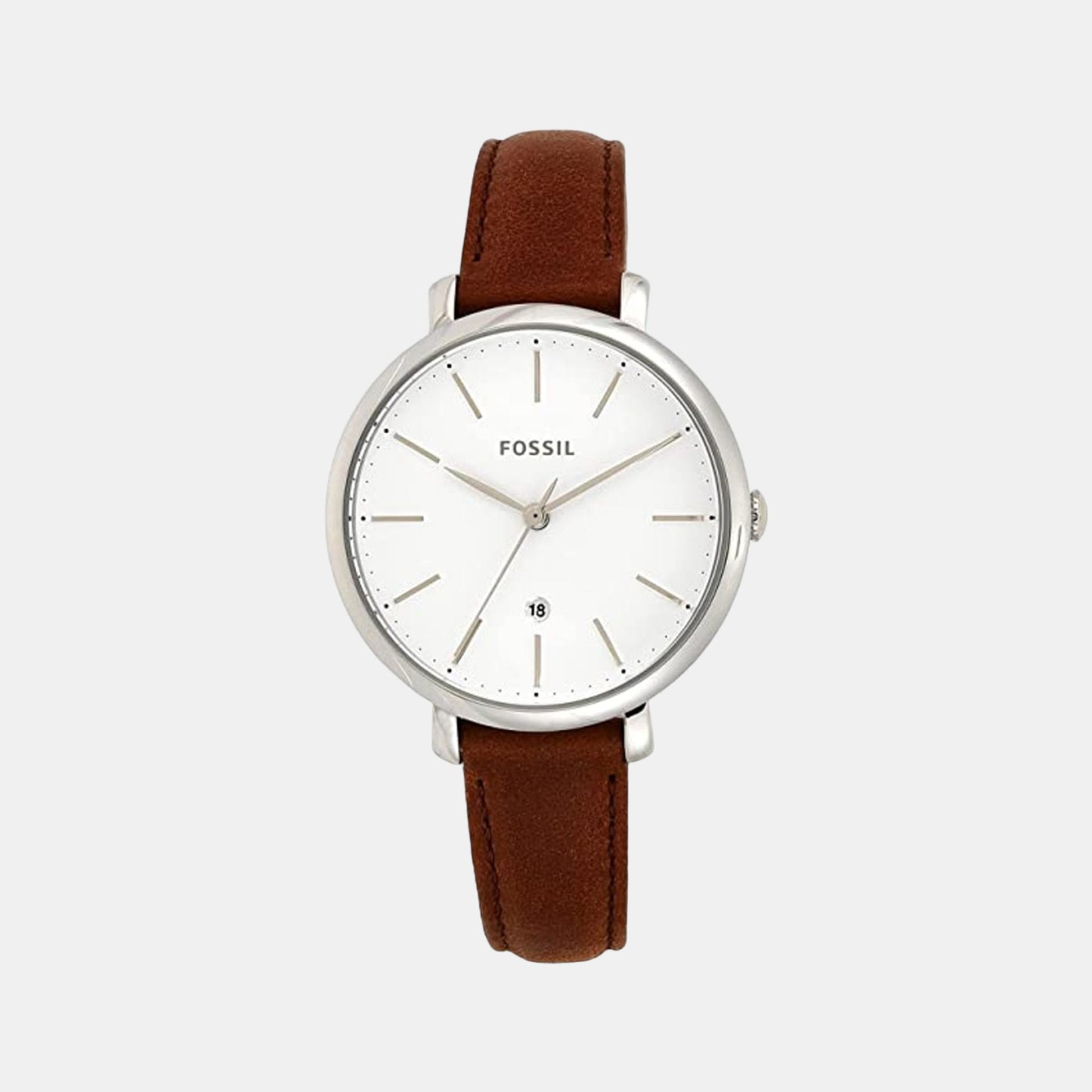 Take your look up several notches with this women's analog watch from Fossil's Jacqueline collection. This electronic watch is more accurate than a mechanical movement as it sends energy through a quartz crystal. The Jacqueline watches with an artful construction is inspired by the girl with a certain charm. Housed in a 36 mm case, the white round dial flaunts a stick markings at 5-minute intervals, plain three hands and a crown for time adjustment. Its brown genuine leather strap can be interchanged with all 14mm straps to customize your look according to your wish.