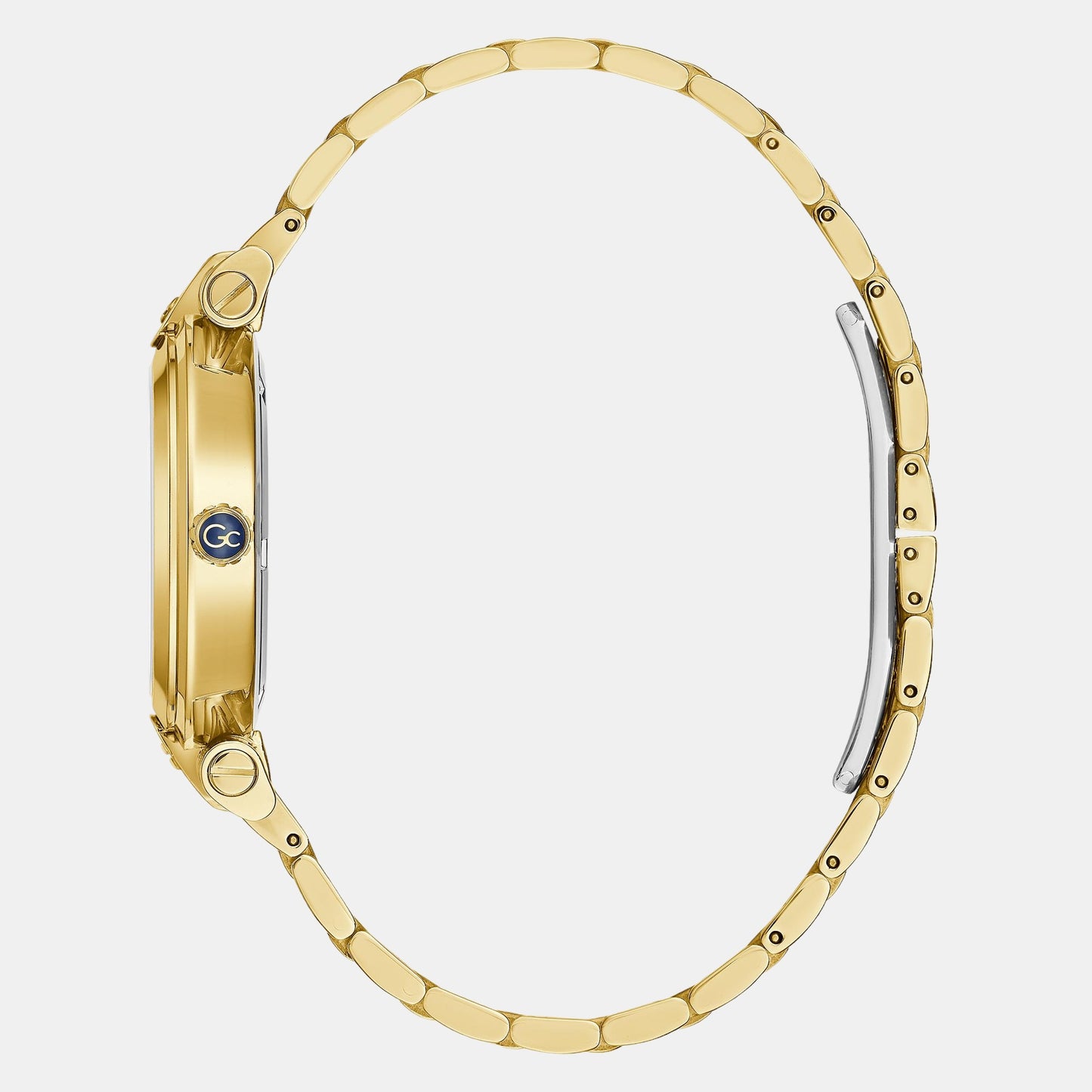 Discover GC watch for women, featuring a white dial, a gold strap made of stainless steel in a round case. Built with mineral glass and stainless steel body to balance clarity and durability. Dimensions include 34 mm dial size, 20mm strap width for comfortable wear. Key features: quartz movement, analog display, 10 atm water resistance. A secure push-button deployment ensures a dependable fit.