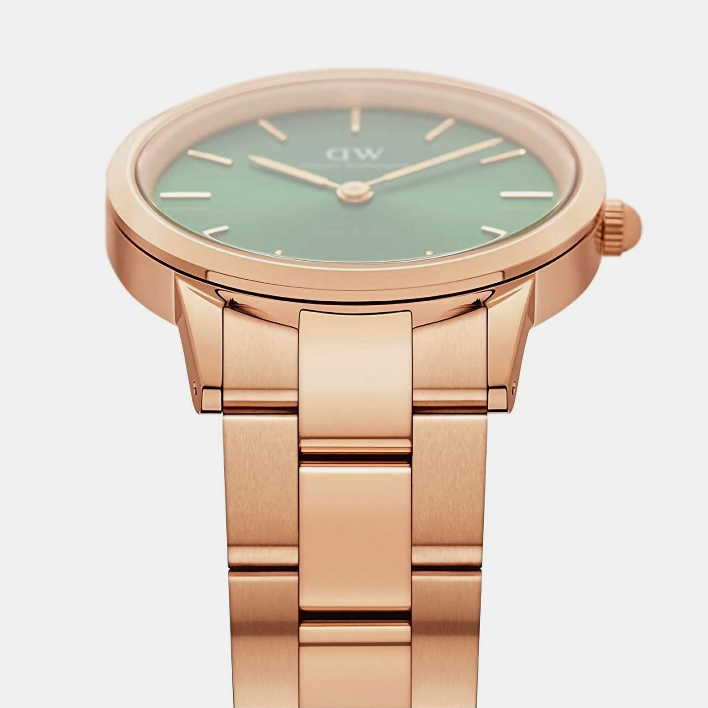 Discover Daniel Wellington watch for women, featuring a green dial, a rose gold strap made of stainless steel in a round case. Built with mineral glass and stainless steel body to balance clarity and durability. Dimensions include 32 mm dial size, 8.5 mm profile for comfortable wear. Key features: quartz movement, analog display, 3 atm water resistance. A secure butterfly clasp ensures a dependable fit.